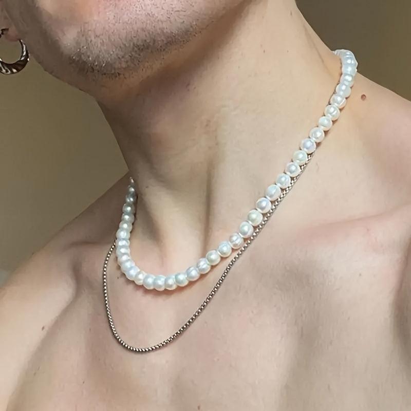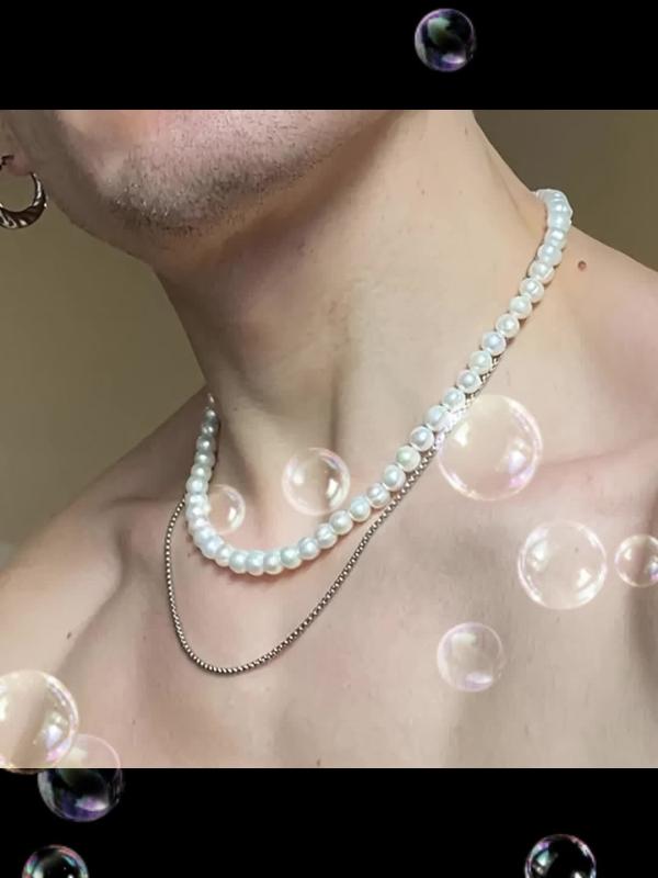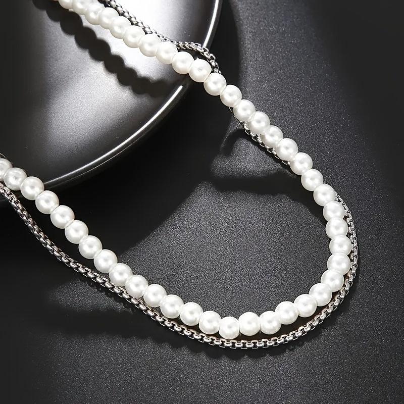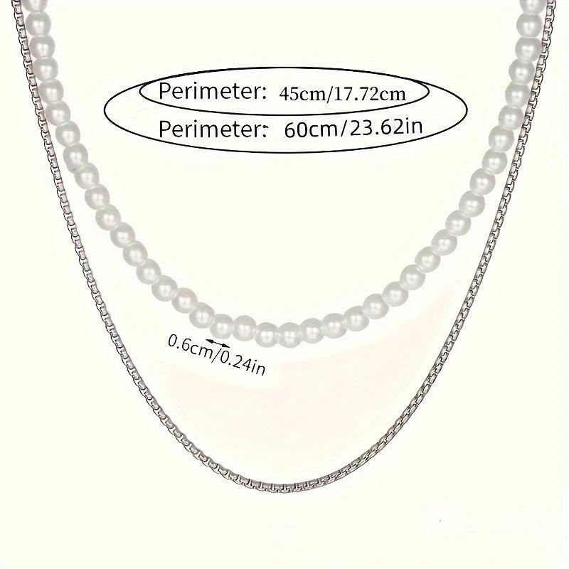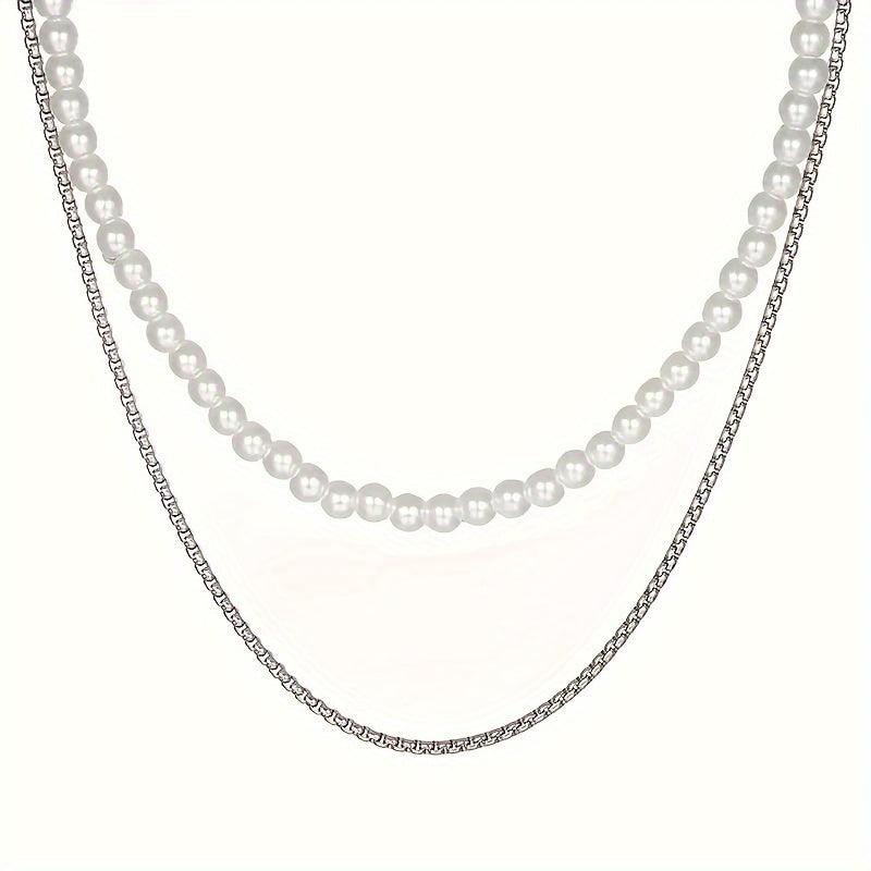 Elegant set of 2 faux pearl necklaces featuring layered stitch stainless steel chains, perfect for parties and special occasions.