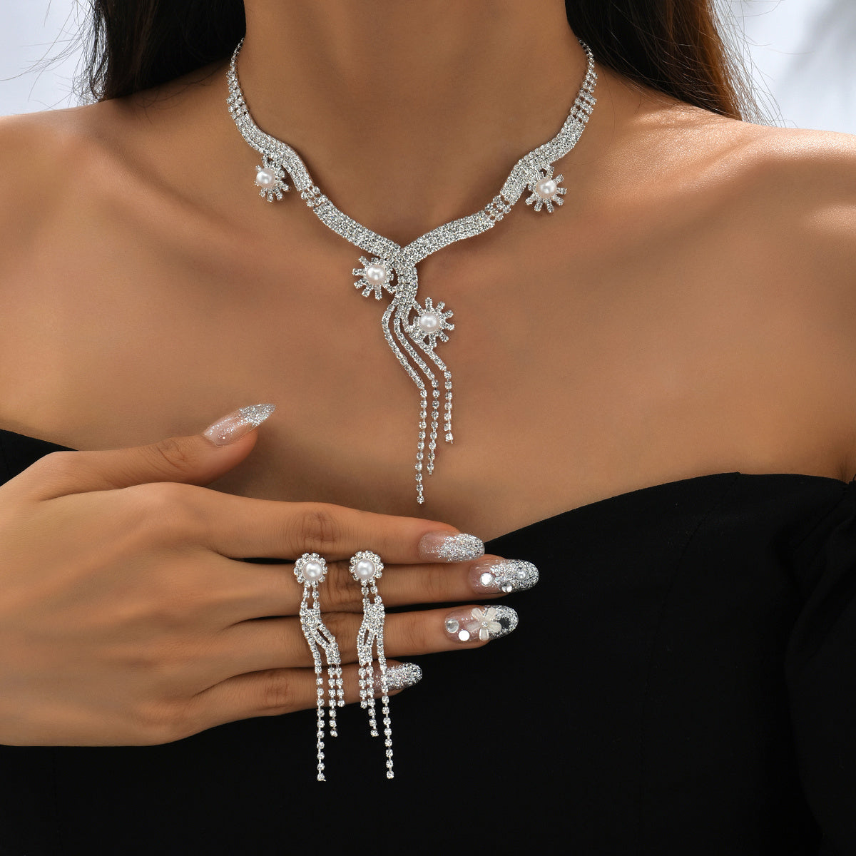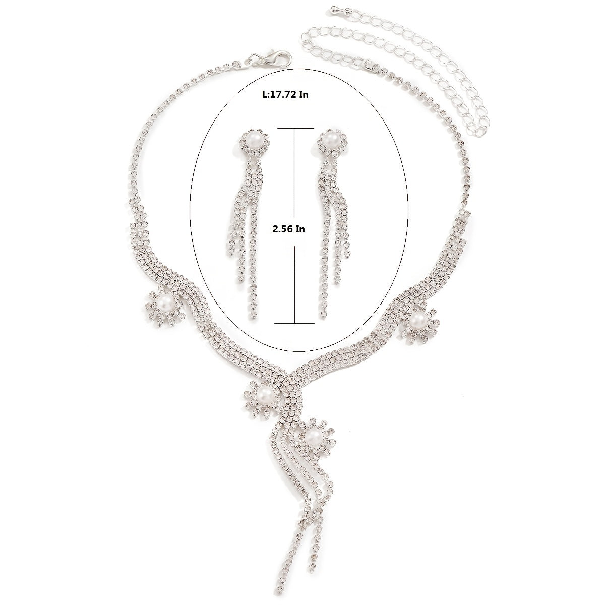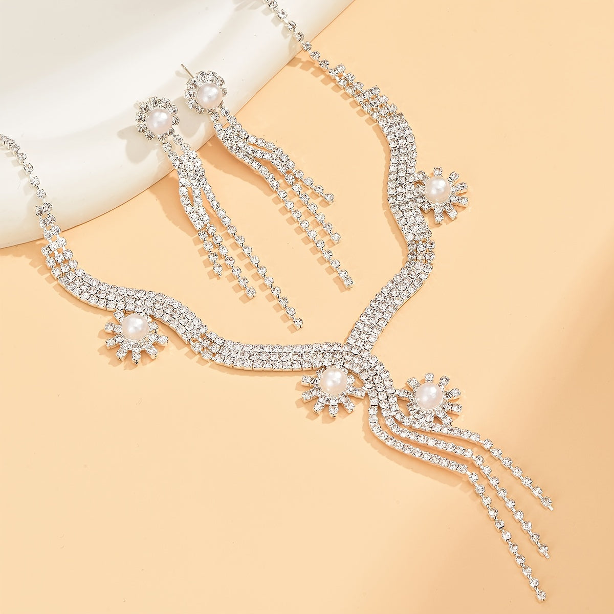 Elegant set featuring faux pearl tassel necklace and crystal stone earrings in a silvery finish.