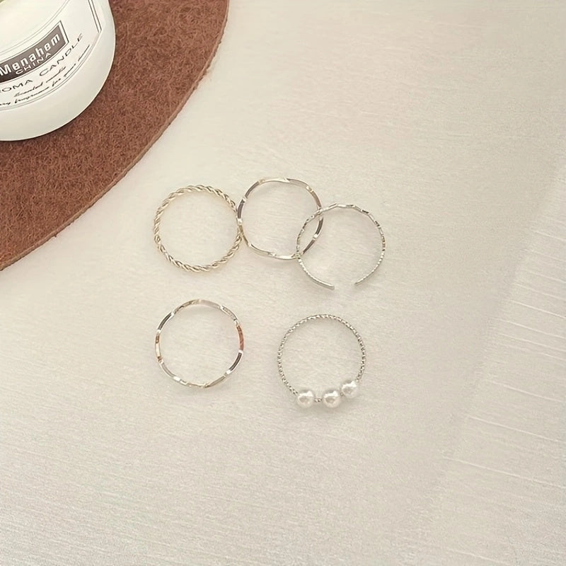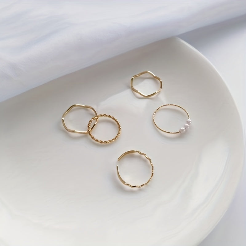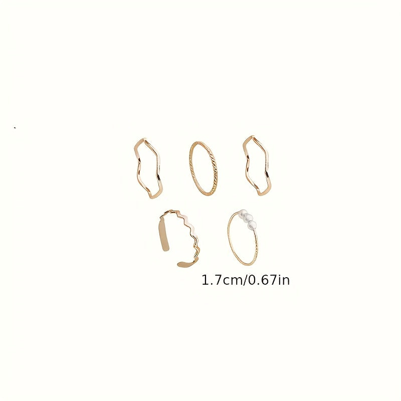 This set includes 5 wave-shaped rings with faux pearl embellishments. The rings are adjustable to fit any finger size.