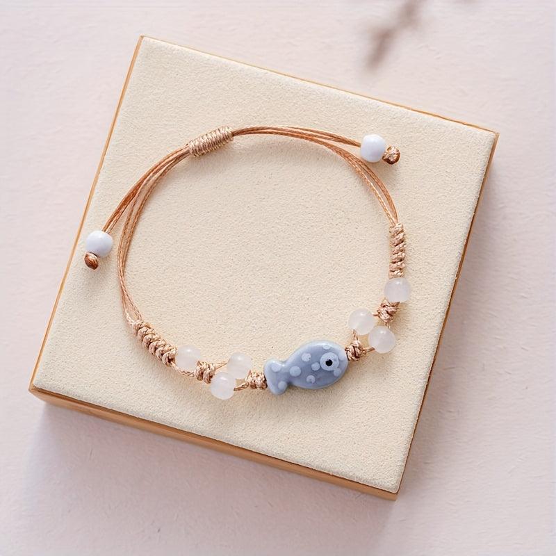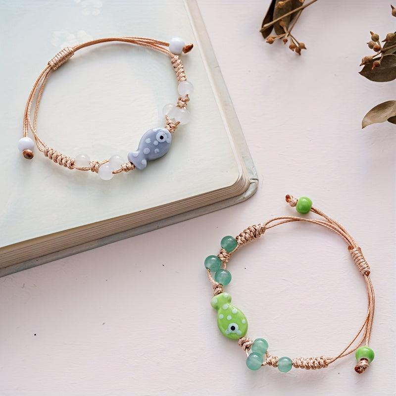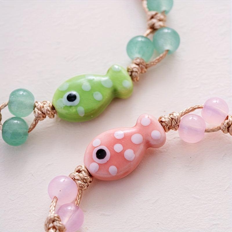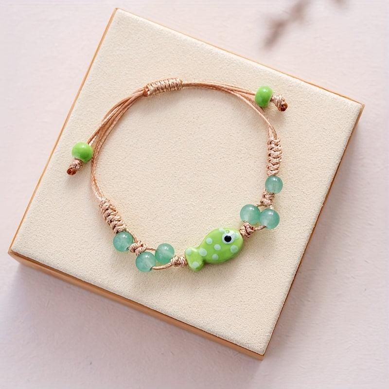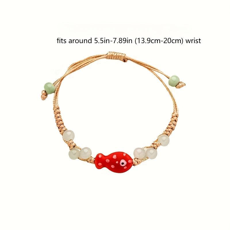 Fish Charm Bracelet Green Beads Red Cord Jewelry for Casual Attire