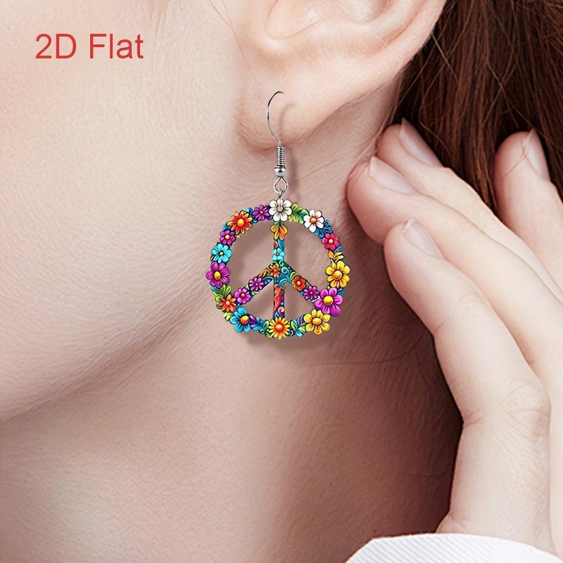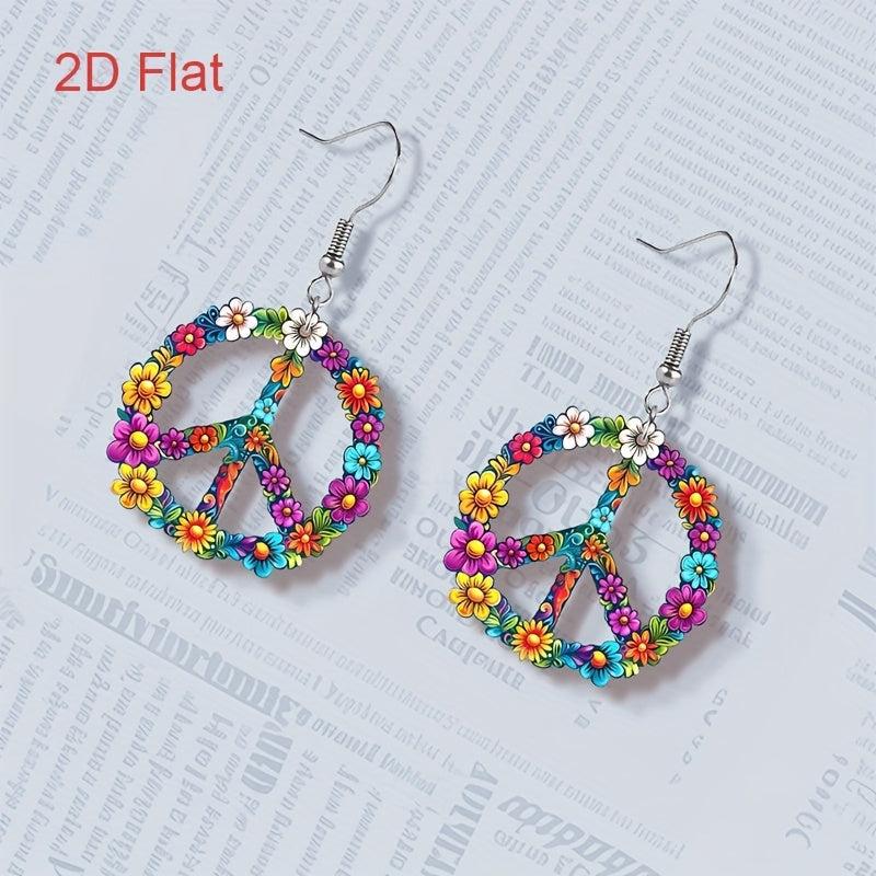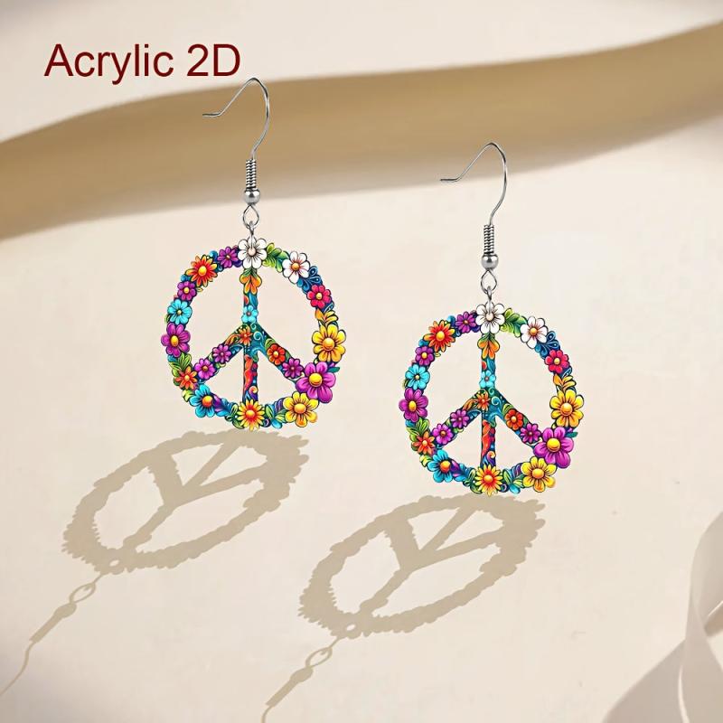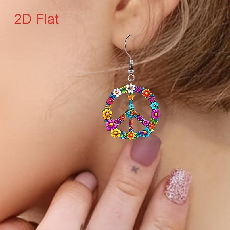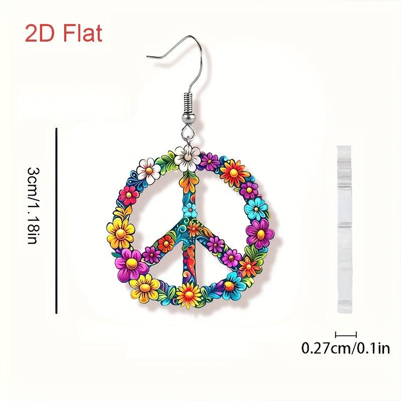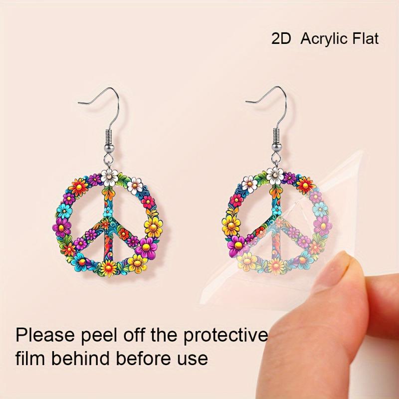 Colorful acrylic peace sign flower earrings with iron hooks. Perfect daily accessory for women. Great gift idea for all occasions.