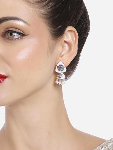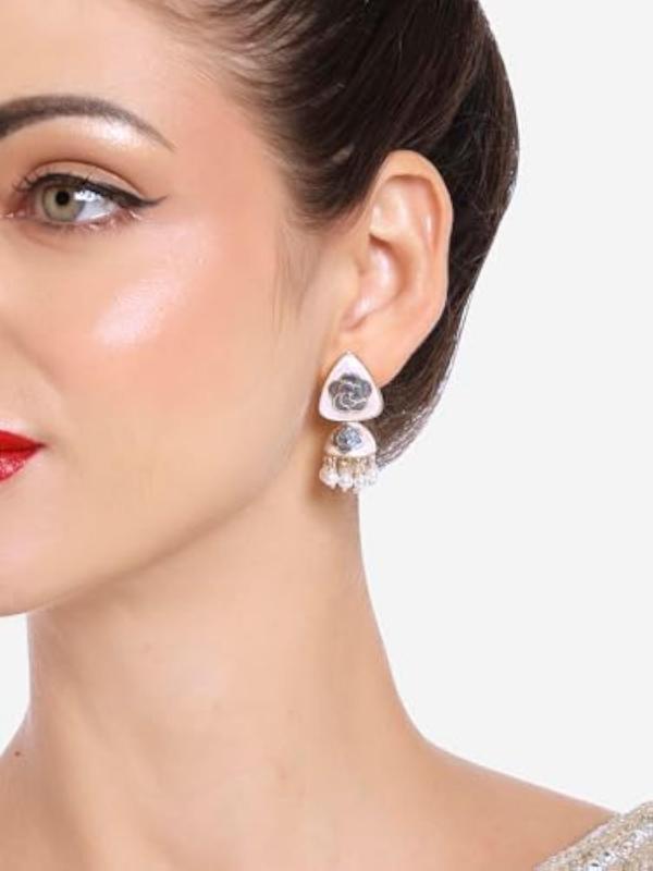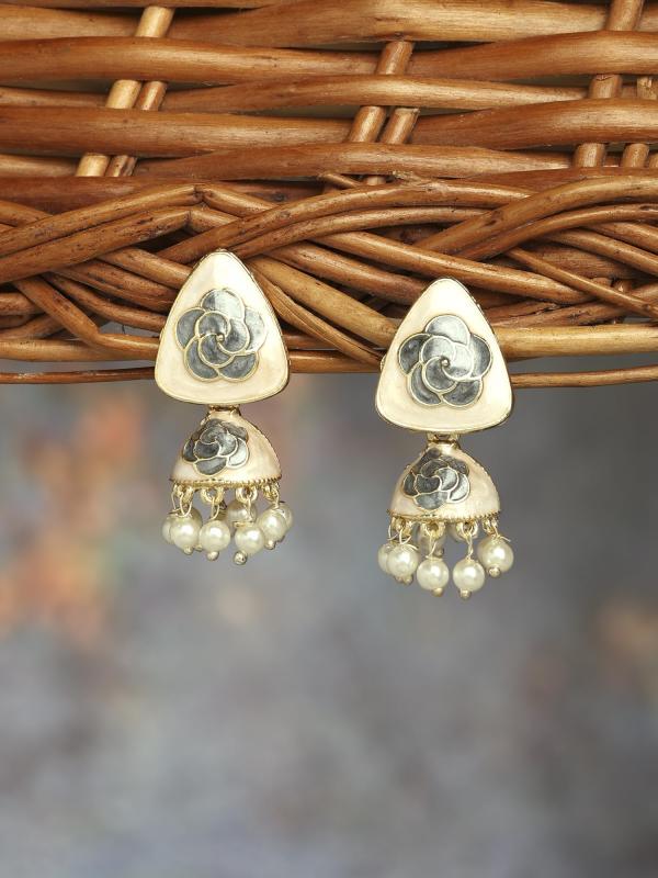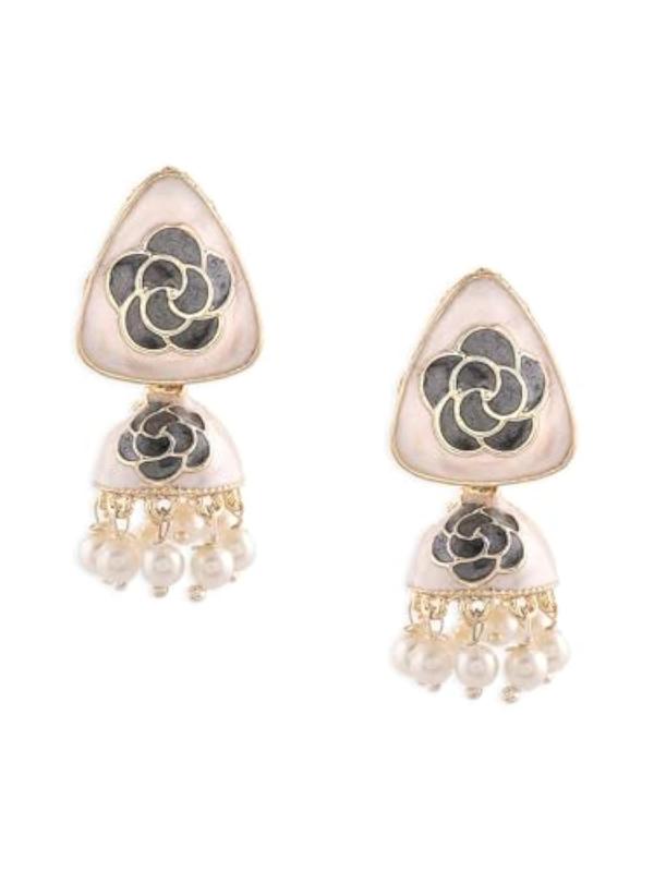 Elegant jhumki earrings featuring beige and grey floral enamel beads. Perfect for adding a touch of tradition to any outfit.