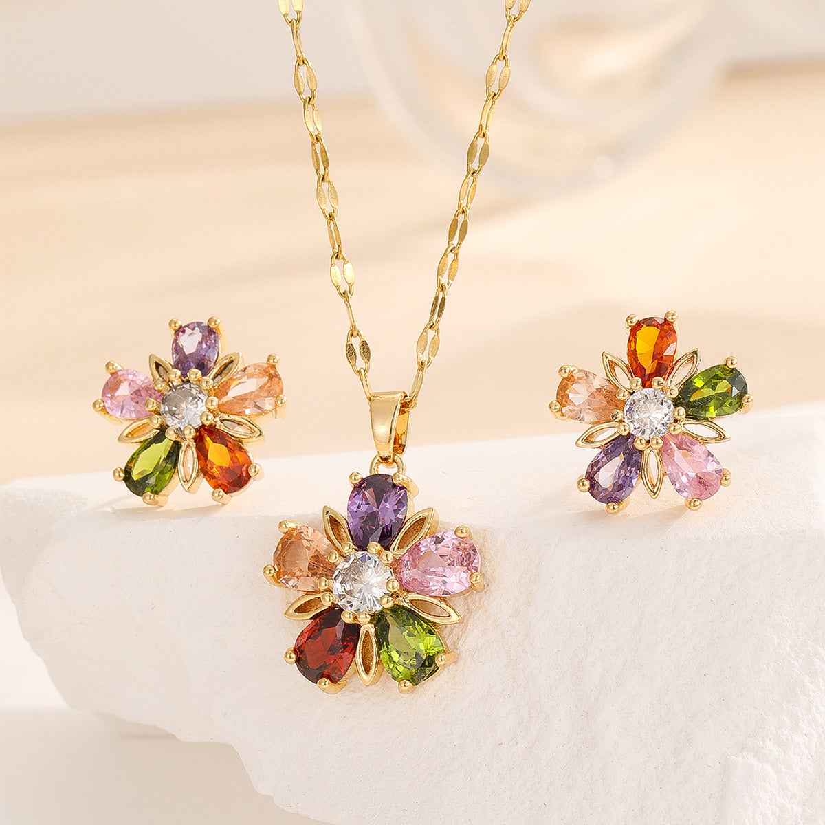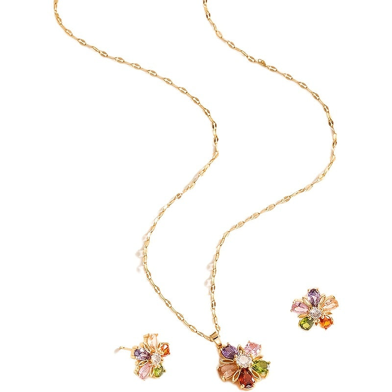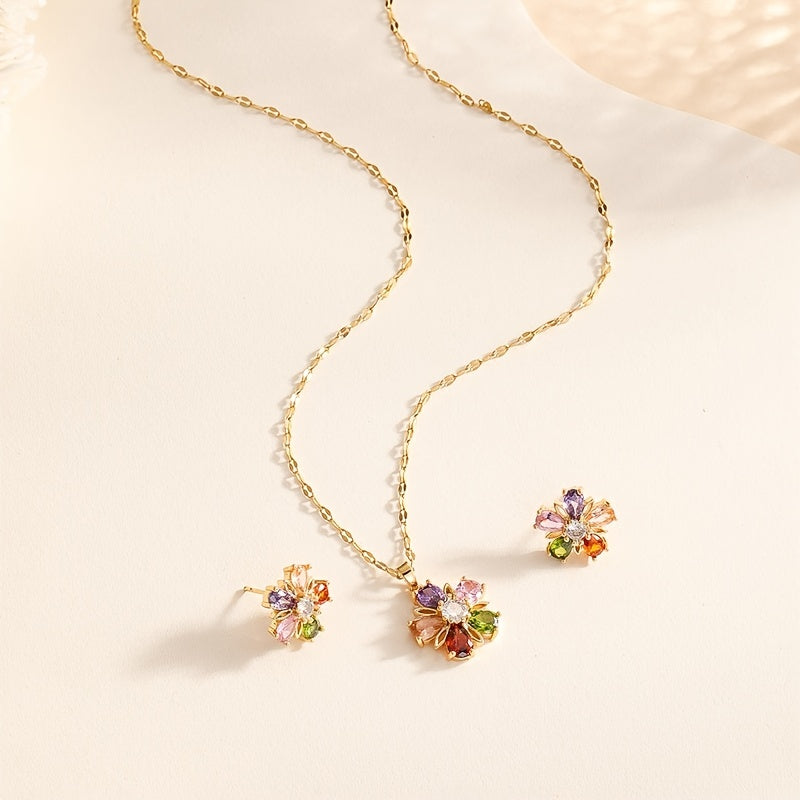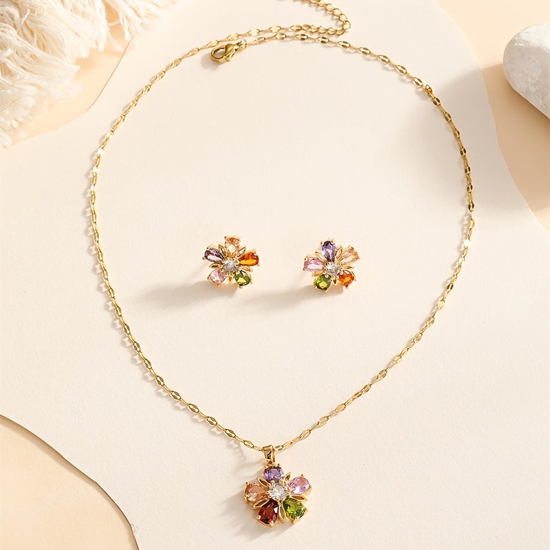 Complete your look with this stunning Flower Shape Jewelry Set featuring a pendant necklace and stud earrings. Crafted from high-quality 18k plated copper, this set is perfect for adding a pop of color to any outfit.