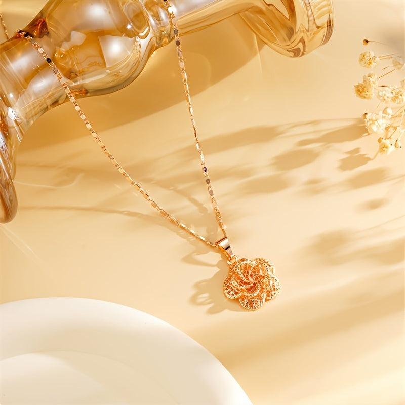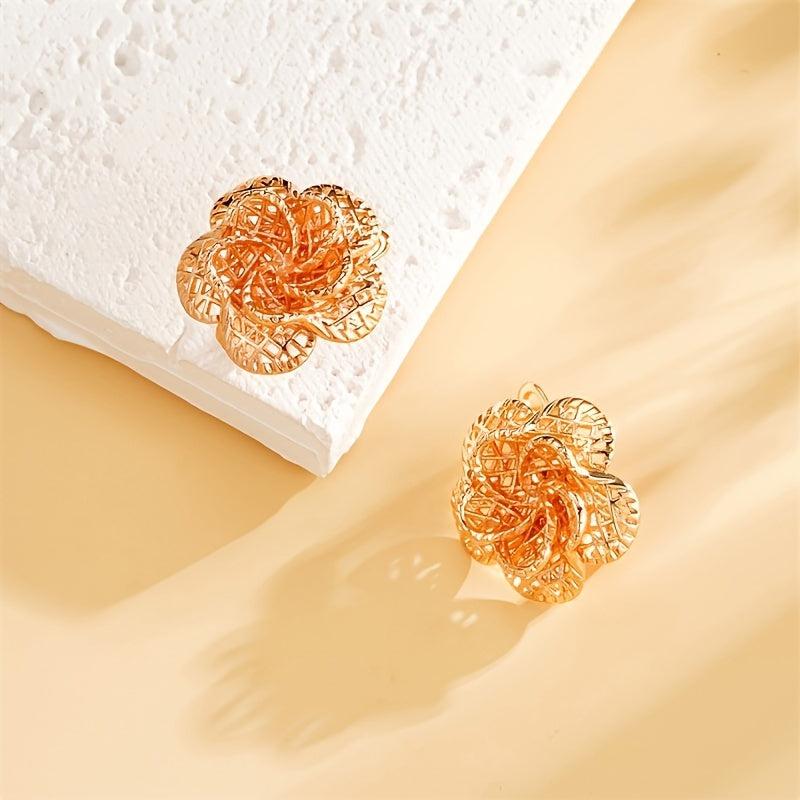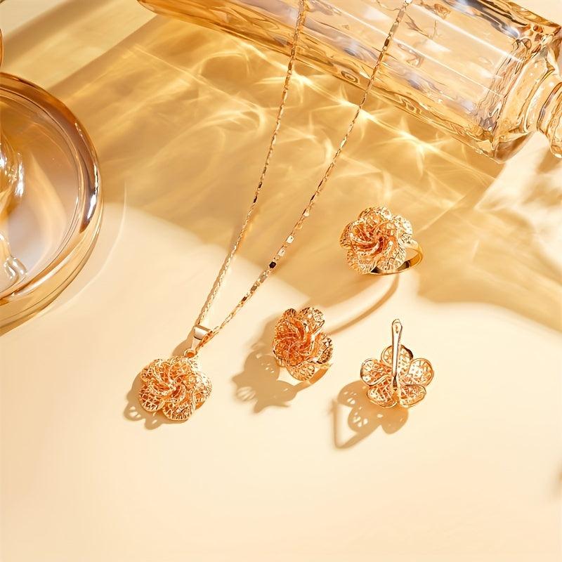 Add a touch of elegance to your outfit with this flower-shaped jewelry set. Perfect for parties, this set includes a necklace, earrings, and ring. The D-shaped buckle earrings are versatile and can be worn with a variety of outfits.