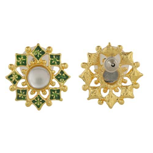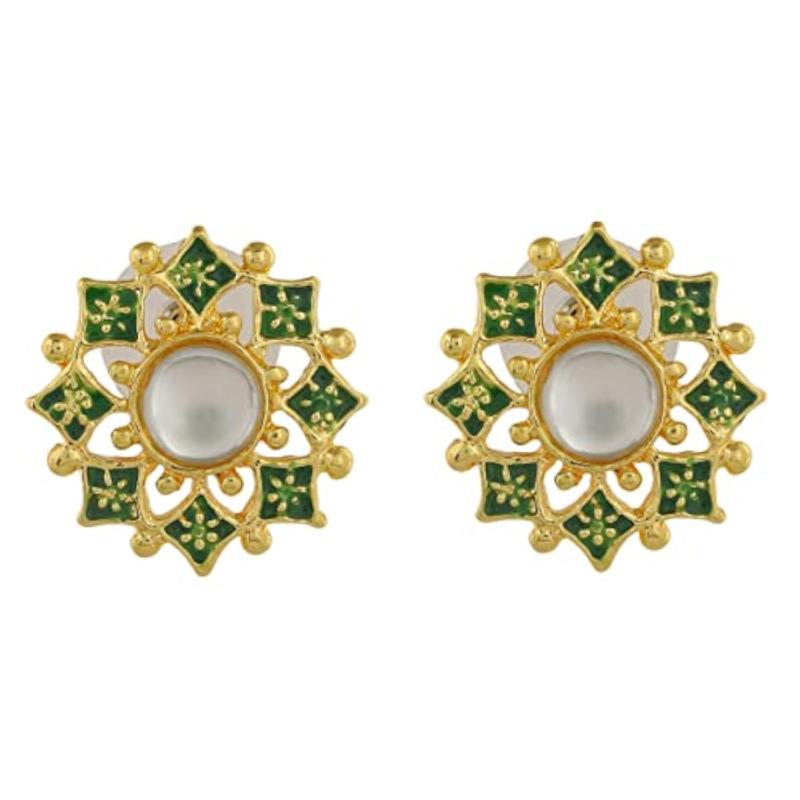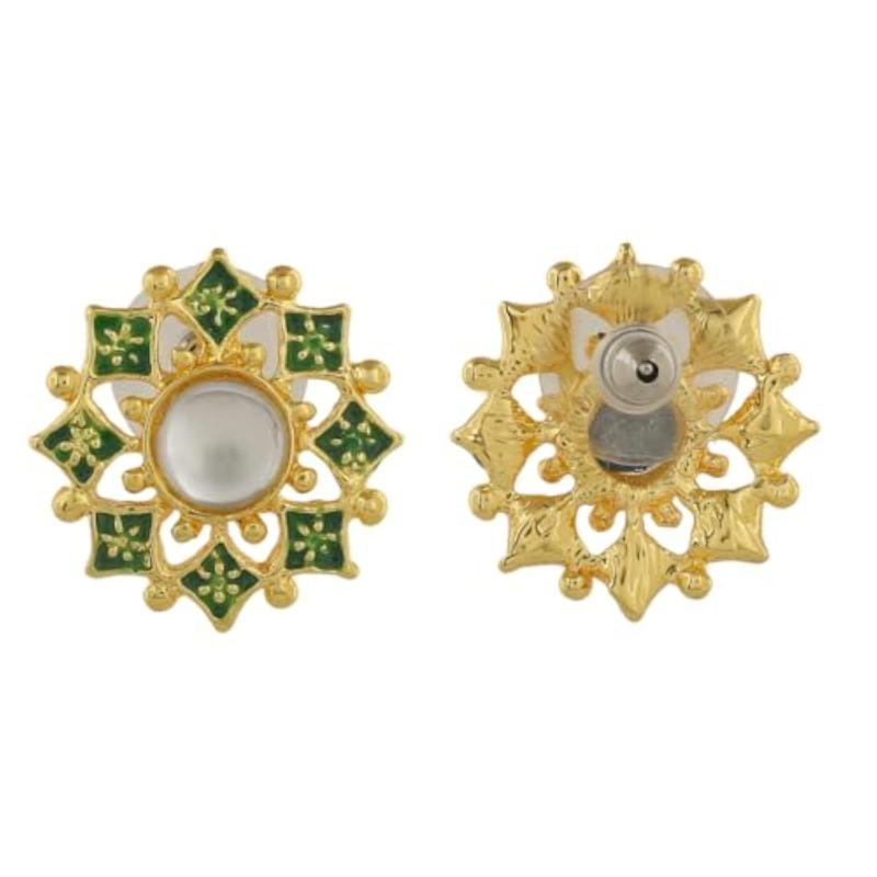 Elegant flower shaped stud earrings with meenakari work and kundan embellishments.