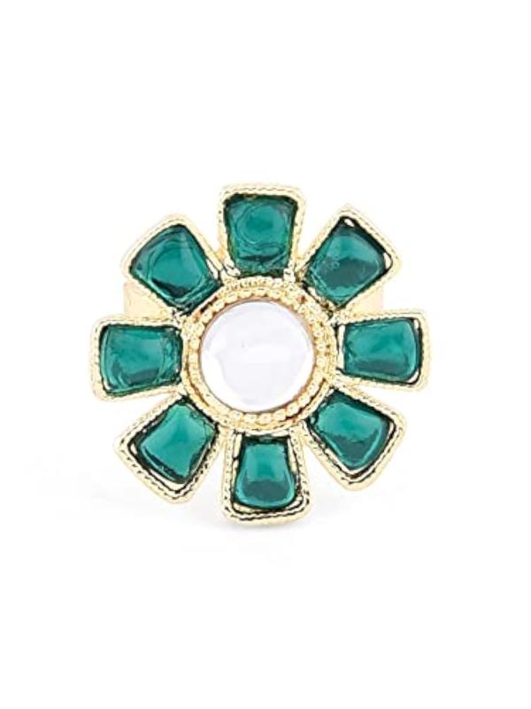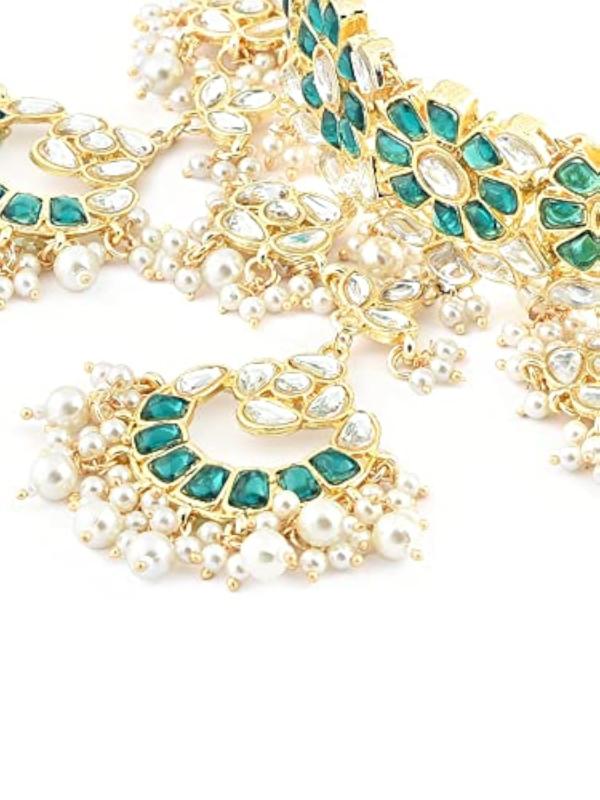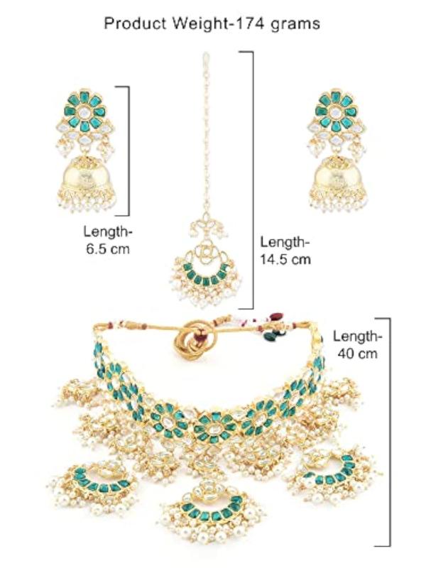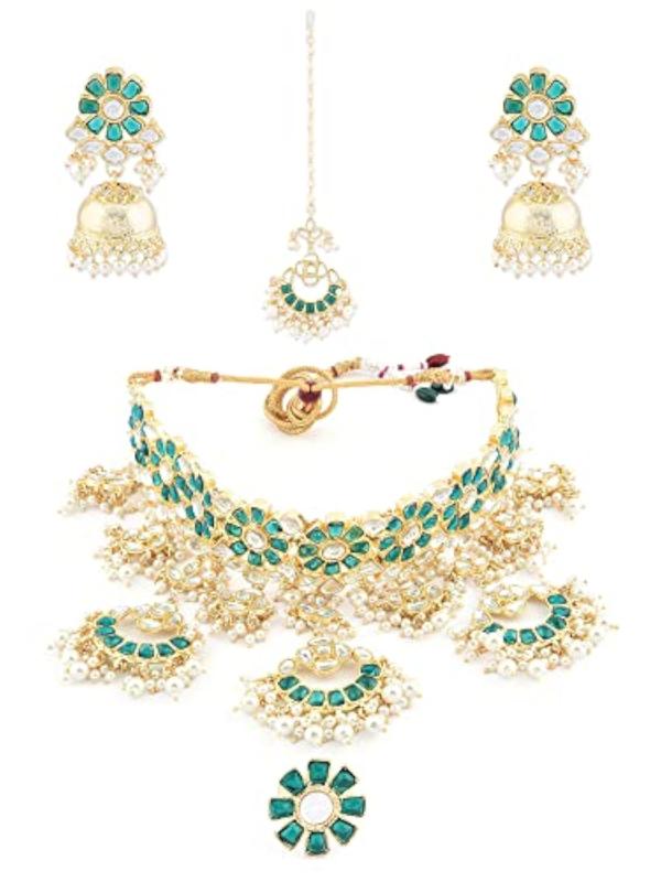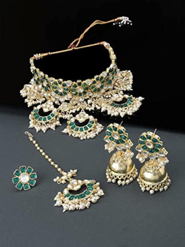 This stunning set includes a choker necklace, earrings, maangtikka, and ring, perfect for bridal wear.