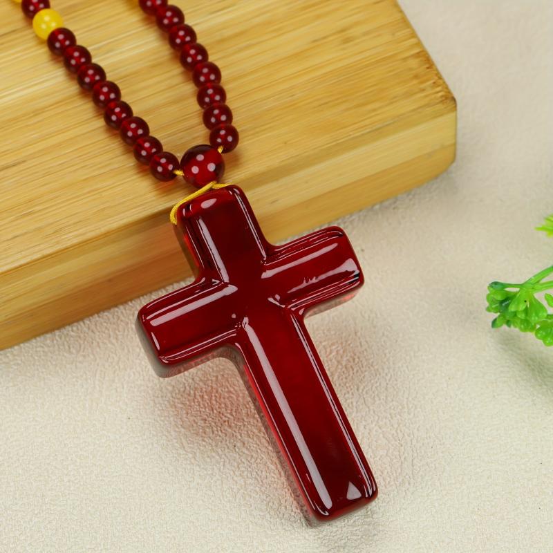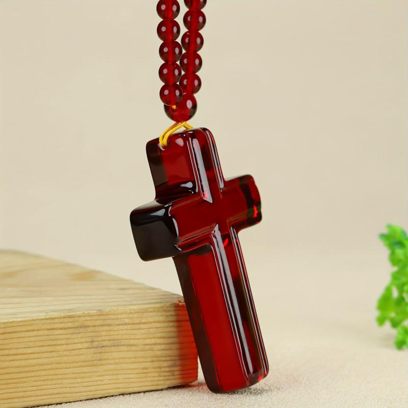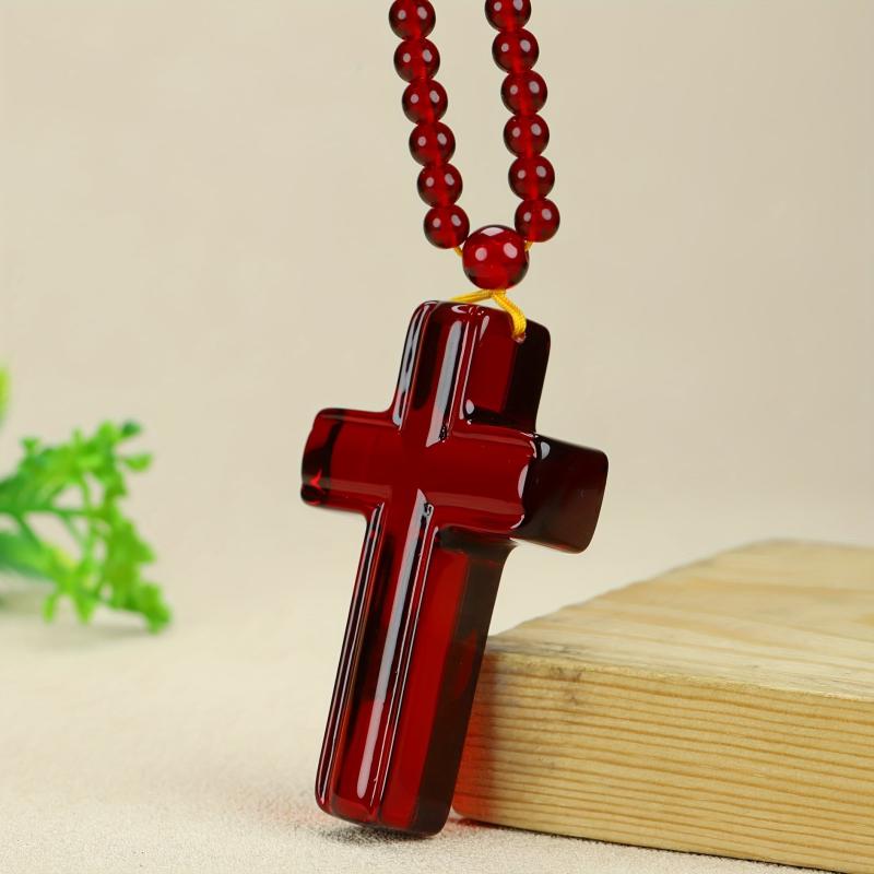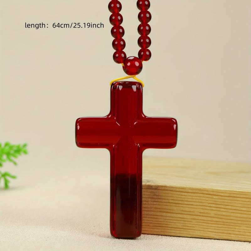 This unique pendant features a fluorescent beeswax cross design with a blood pool effect. A striking and eye-catching accessory.