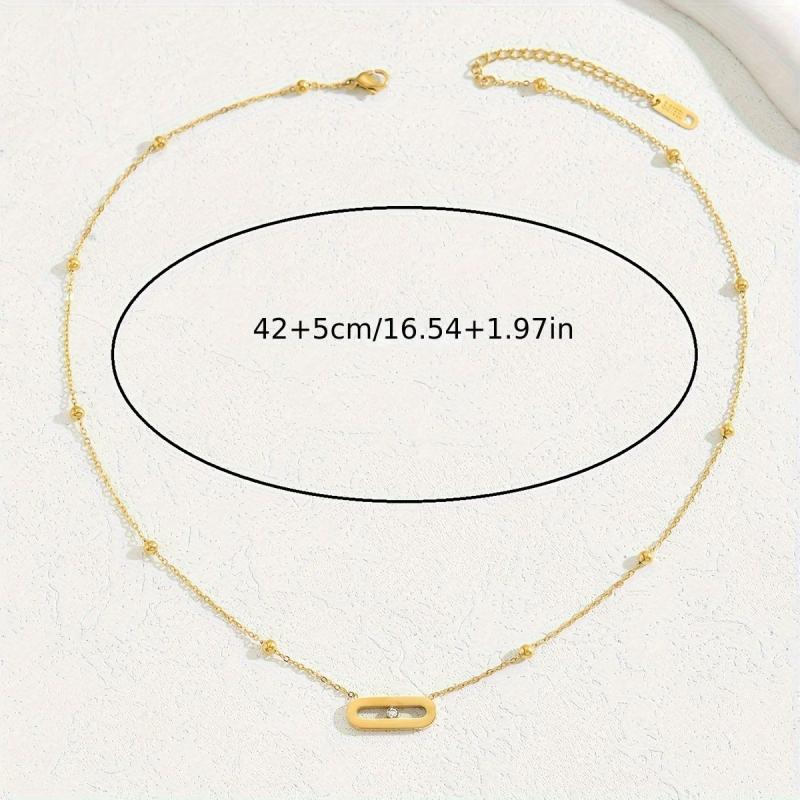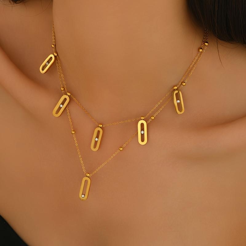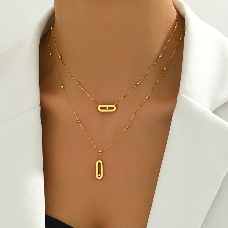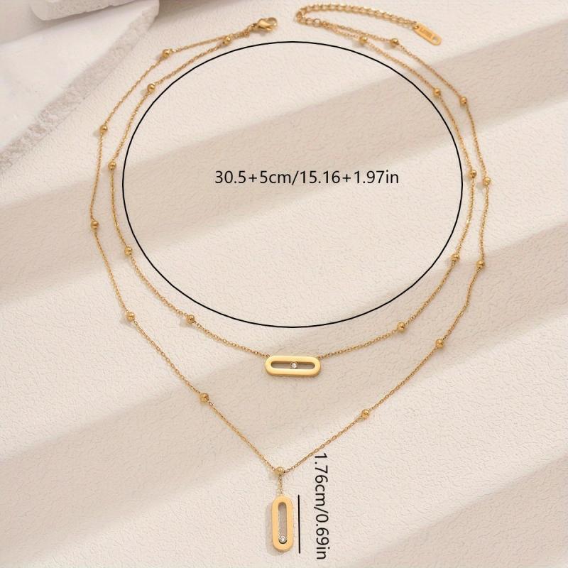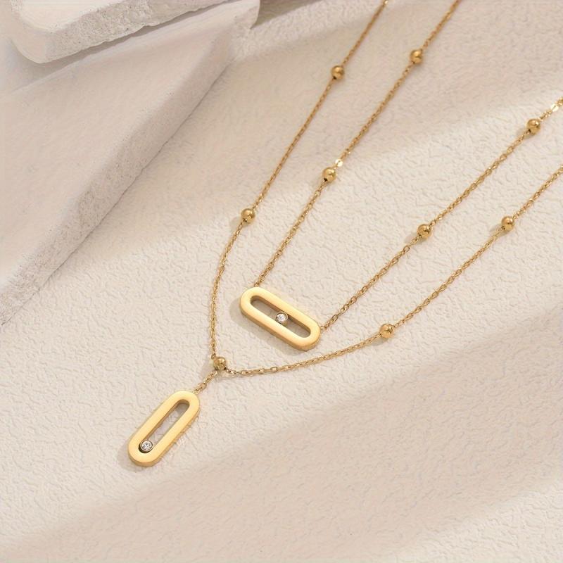 Add a touch of elegance to your outfit with this French style double layer necklace featuring a versatile geometric pendant with rhinestone accents. Crafted from 18K golden plated stainless steel, this necklace is perfect for everyday wear or special occasions.