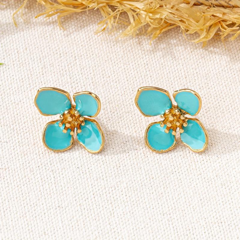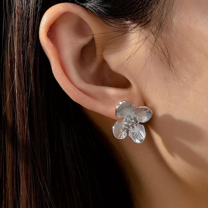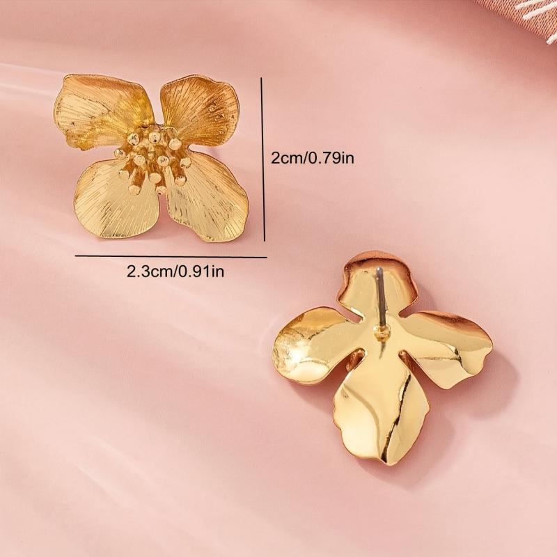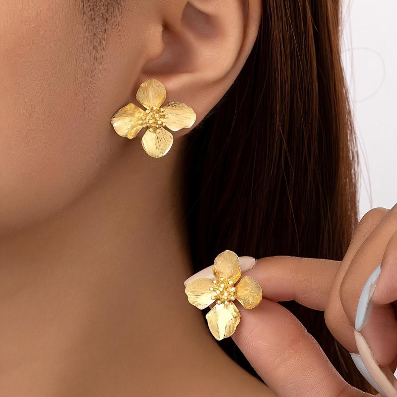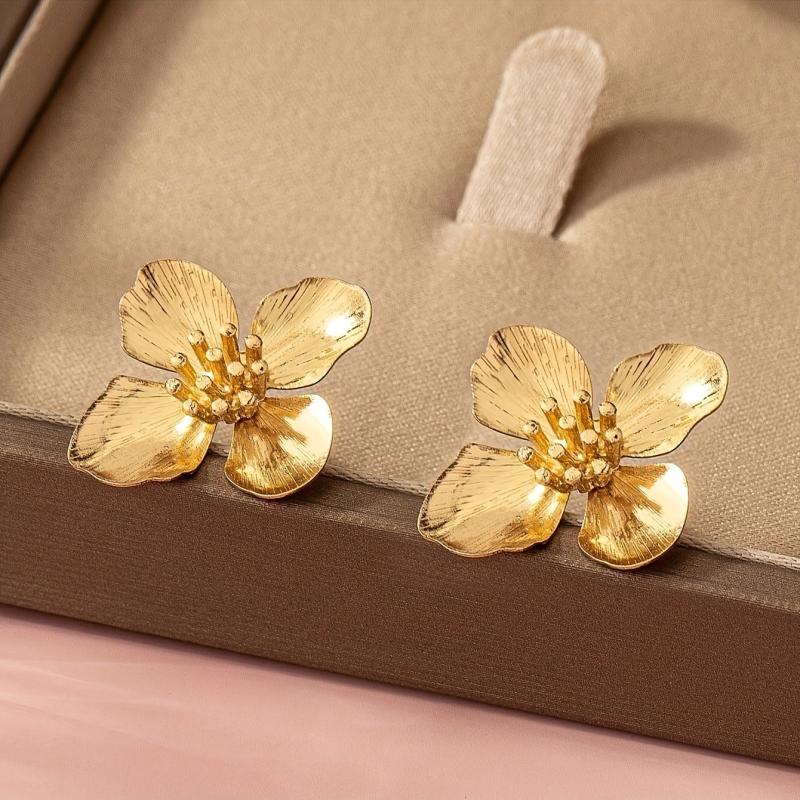 Elegant and versatile pair of French women's earrings made of zinc alloy with flower studs plated in golden color. Perfect for spring and year-round wear.