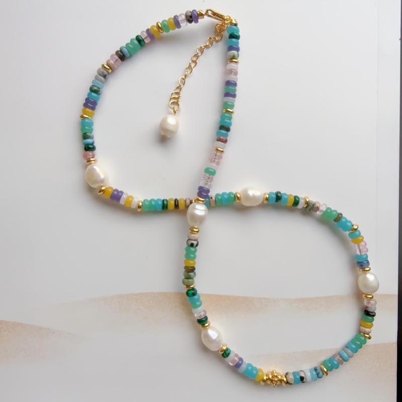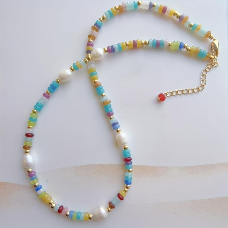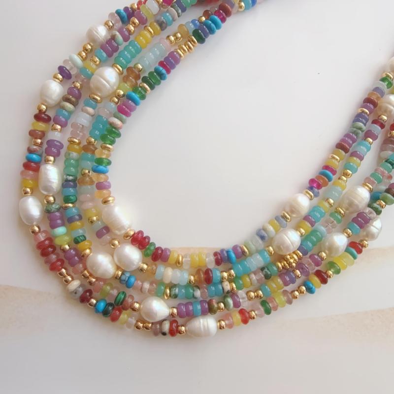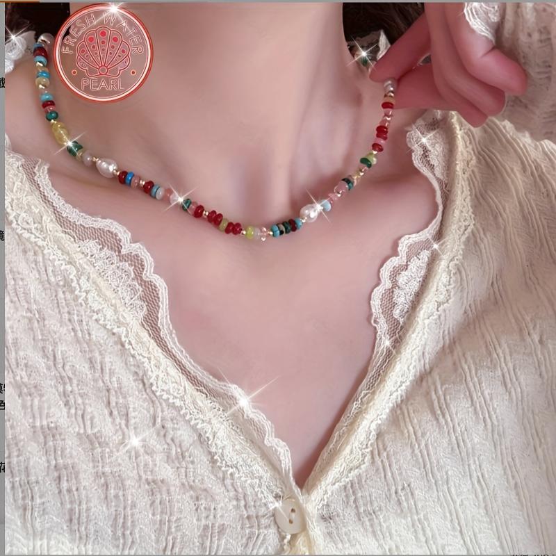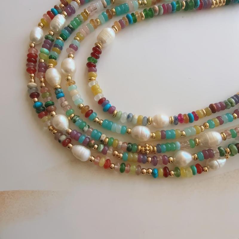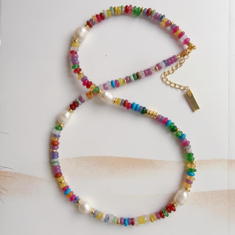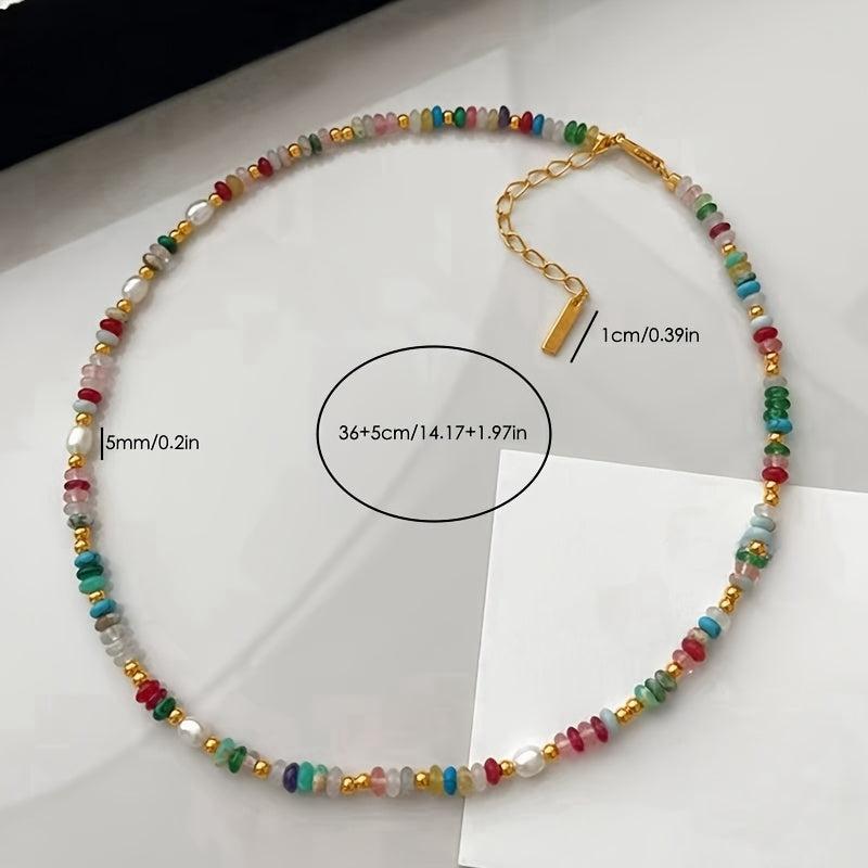 Elegant single strand freshwater pearls necklace featuring multicolor gemstone accents. Perfect for everyday wear or special occasions. Bohemian style jewelry that adds a touch of sophistication to any outfit.