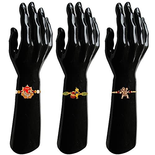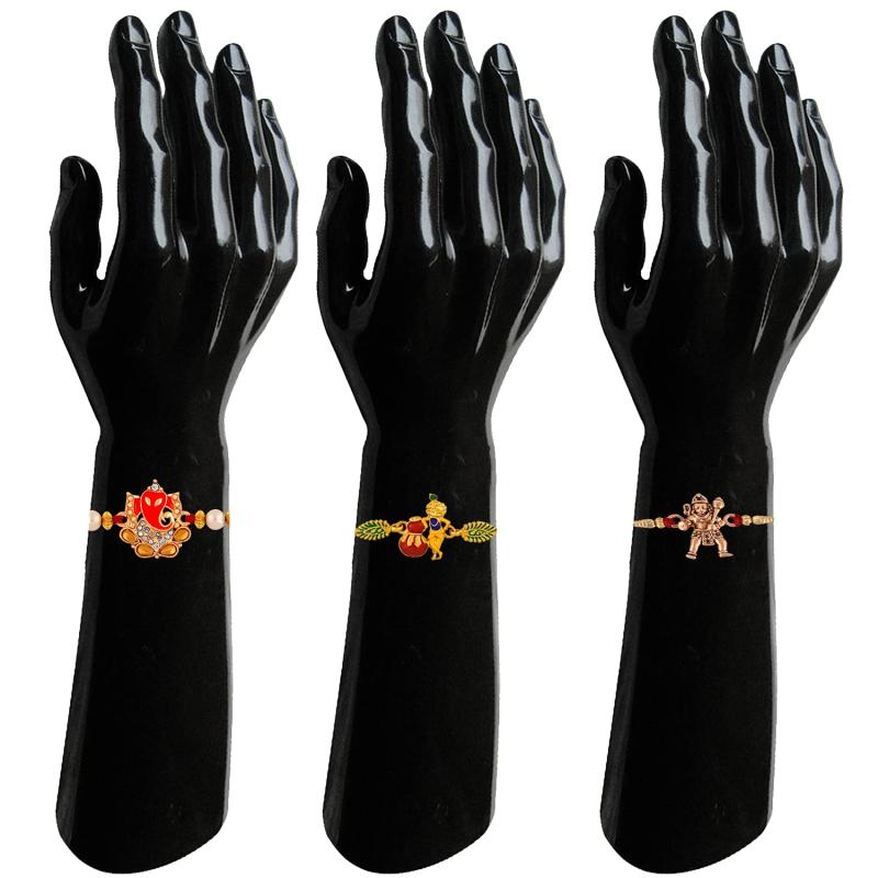 Beautiful combo of Ganesha, Krishana, and Hanuman Rakhi's adorned with crystal and artificial pearl, perfect for your beloved brother.