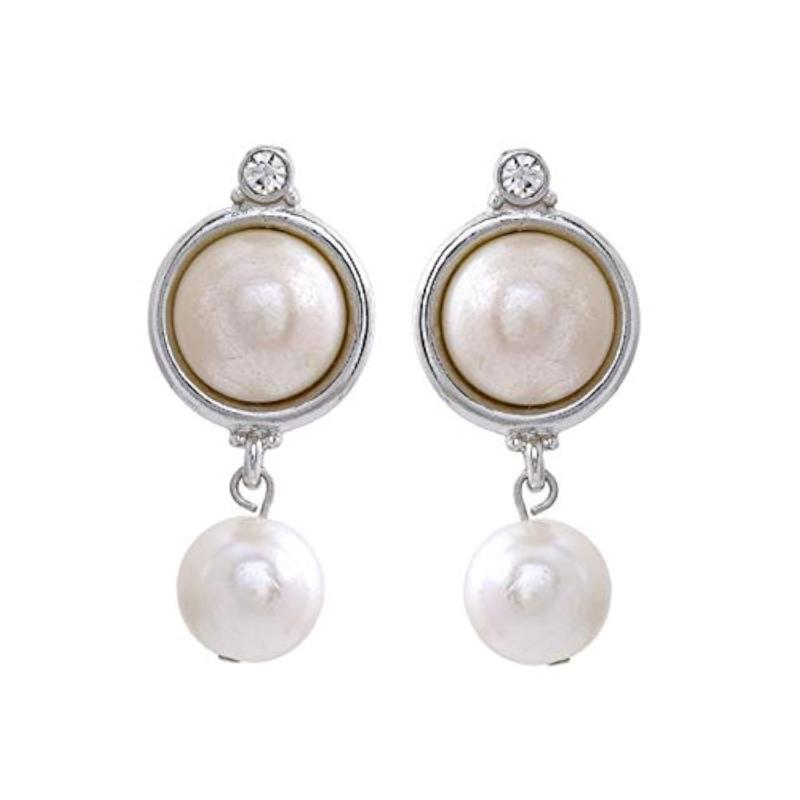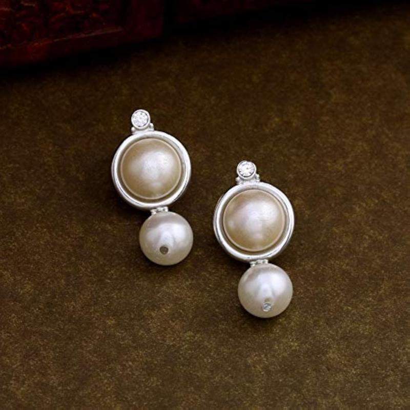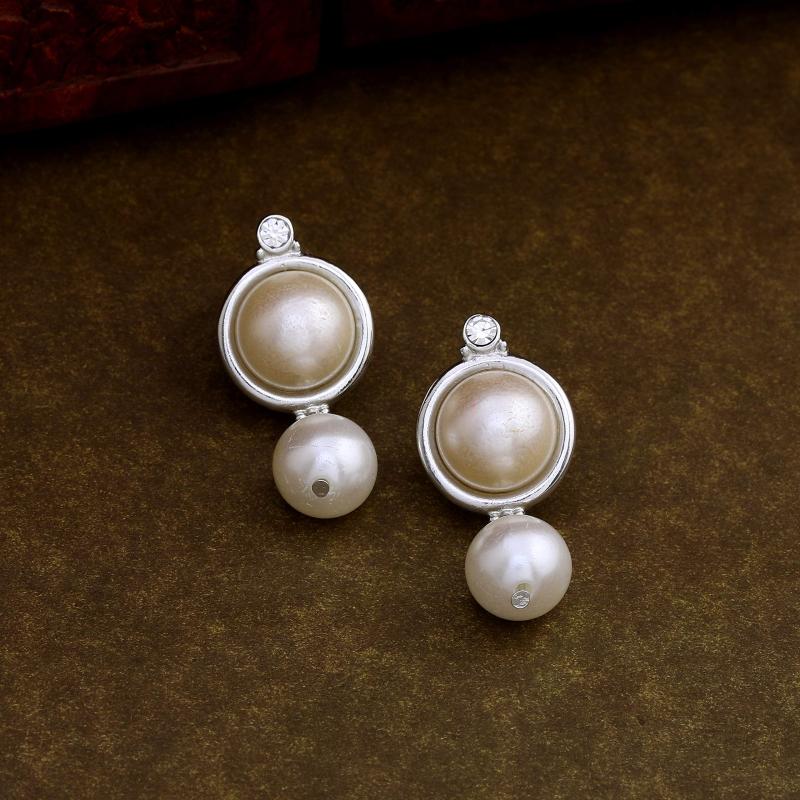 Elegant Rhodium tone earrings featuring pearl ring drops, perfect for any occasion.