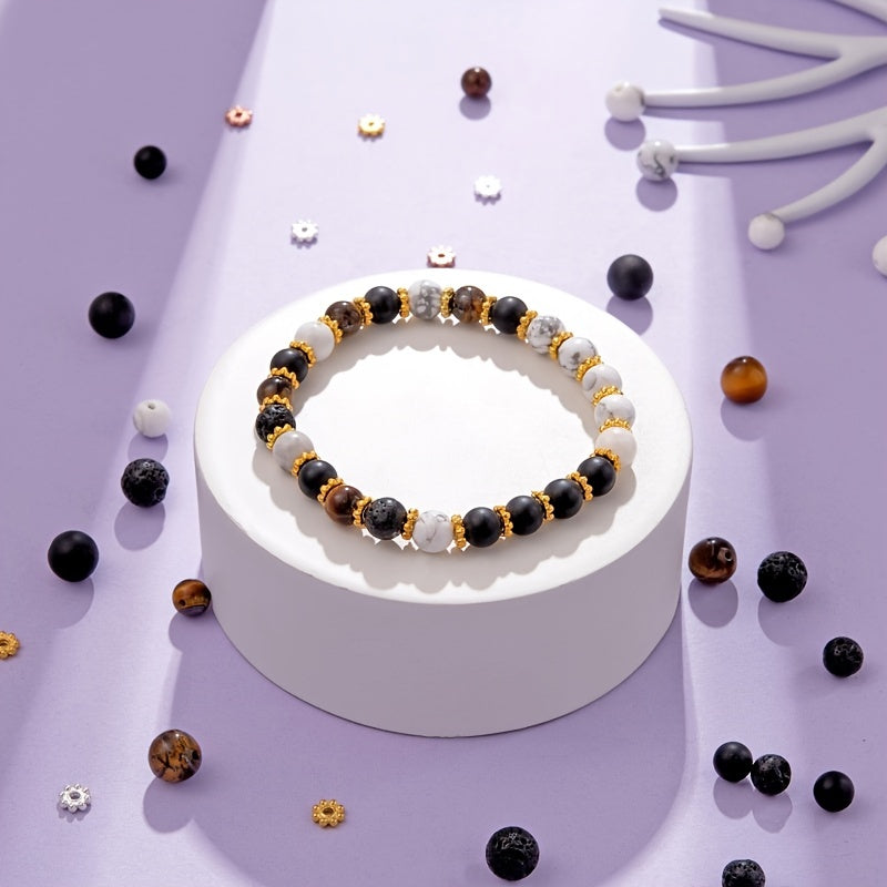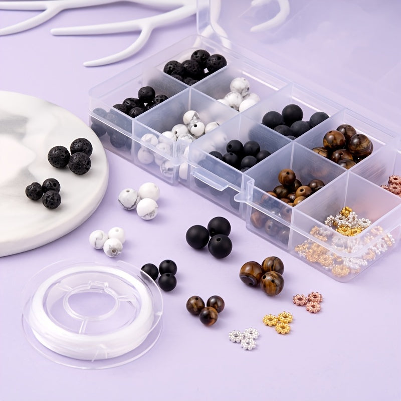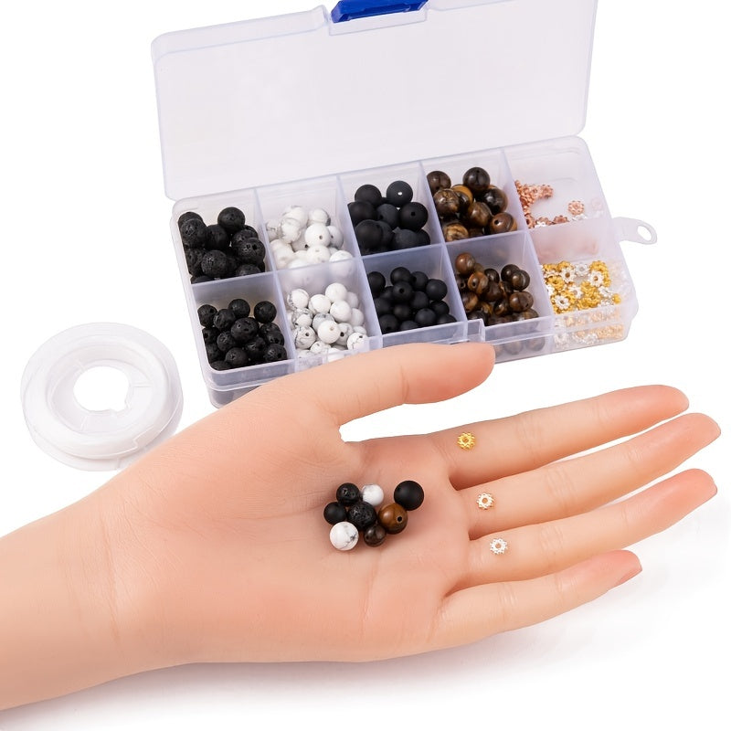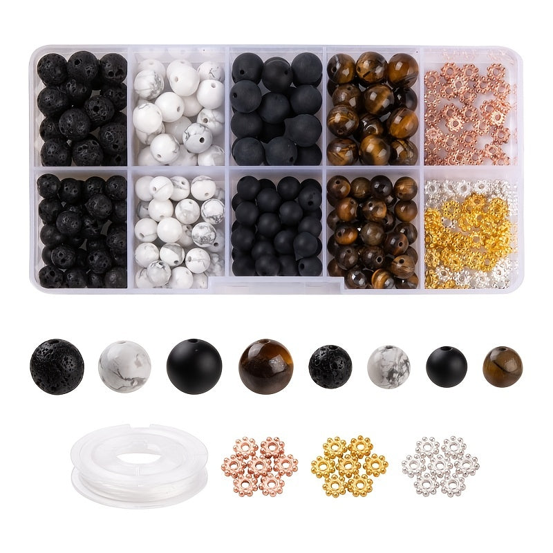 Create beautiful bracelets with this DIY kit that includes natural gemstone round beads, alloy daisy spacer beads, and beading elastic thread.