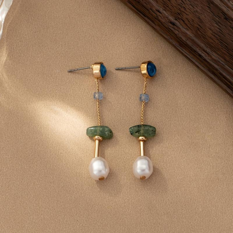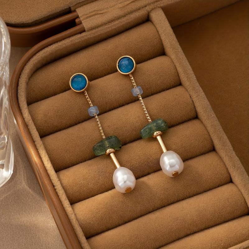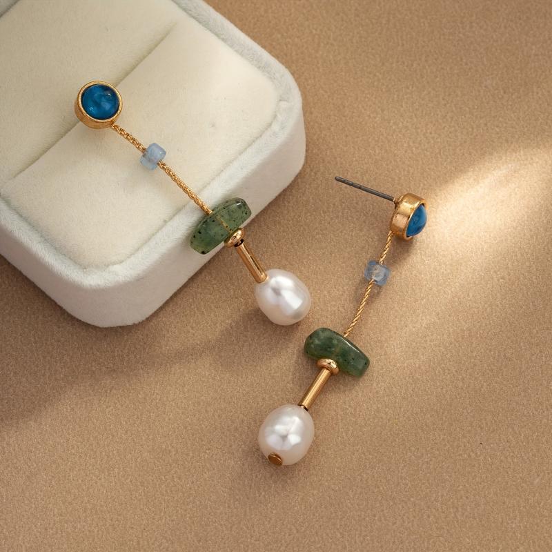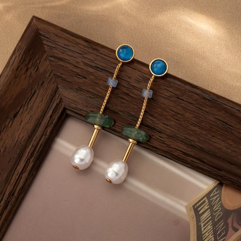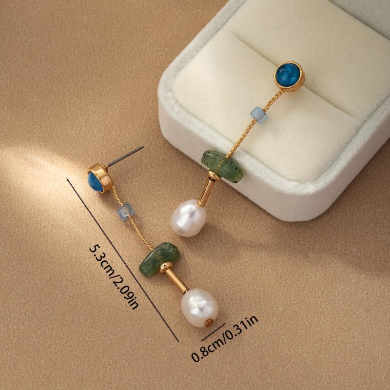 Elegant vintage-inspired earrings featuring geometric beads, faux pearl, and stone accents. Ideal for daily wear or gifting. Made of high-quality golden tone alloy.