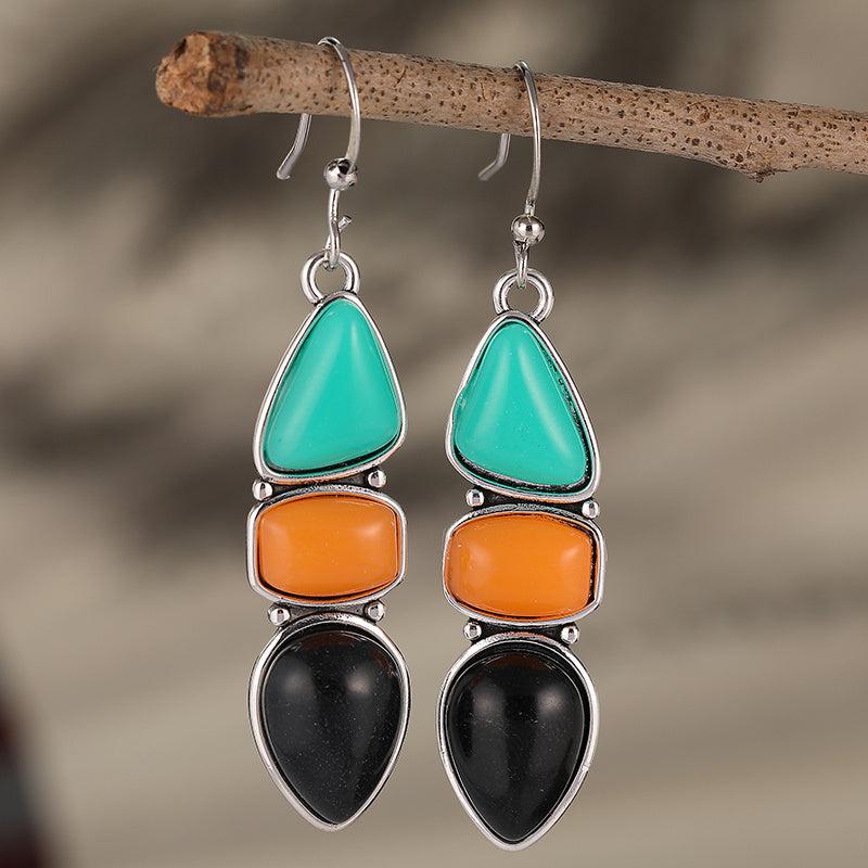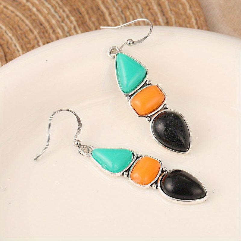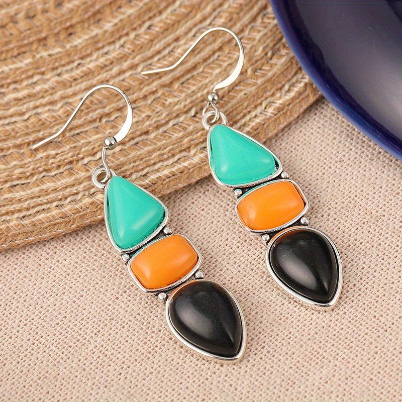 Add a touch of retro charm to your ensemble with these geometric drop earrings featuring synthetic turquoise and orange stones. Ideal for weddings and festive occasions.