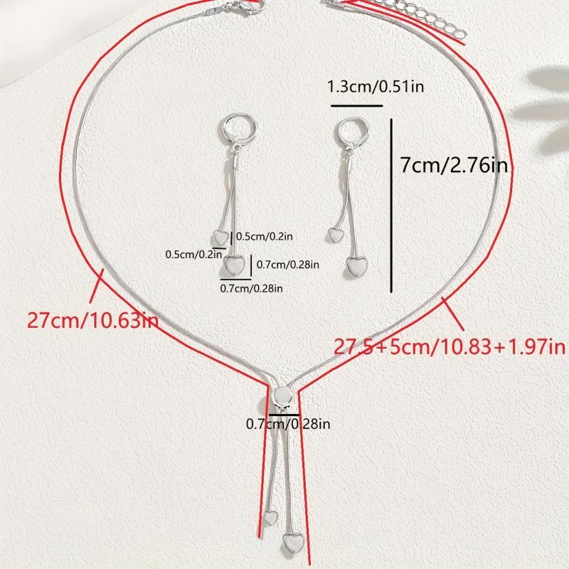 Elevate your look with this 3-piece set featuring a delicate snake chain necklace with an adjustable geometric heart pendant and tassel earrings.