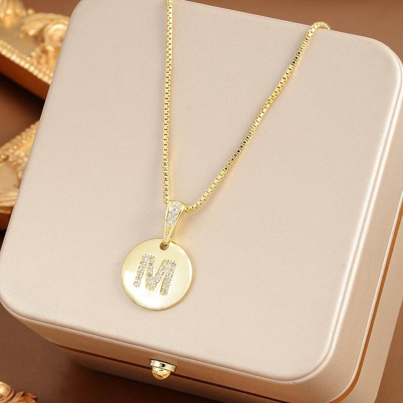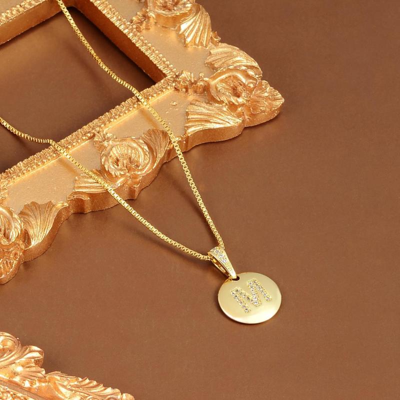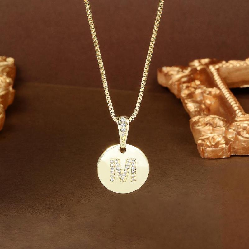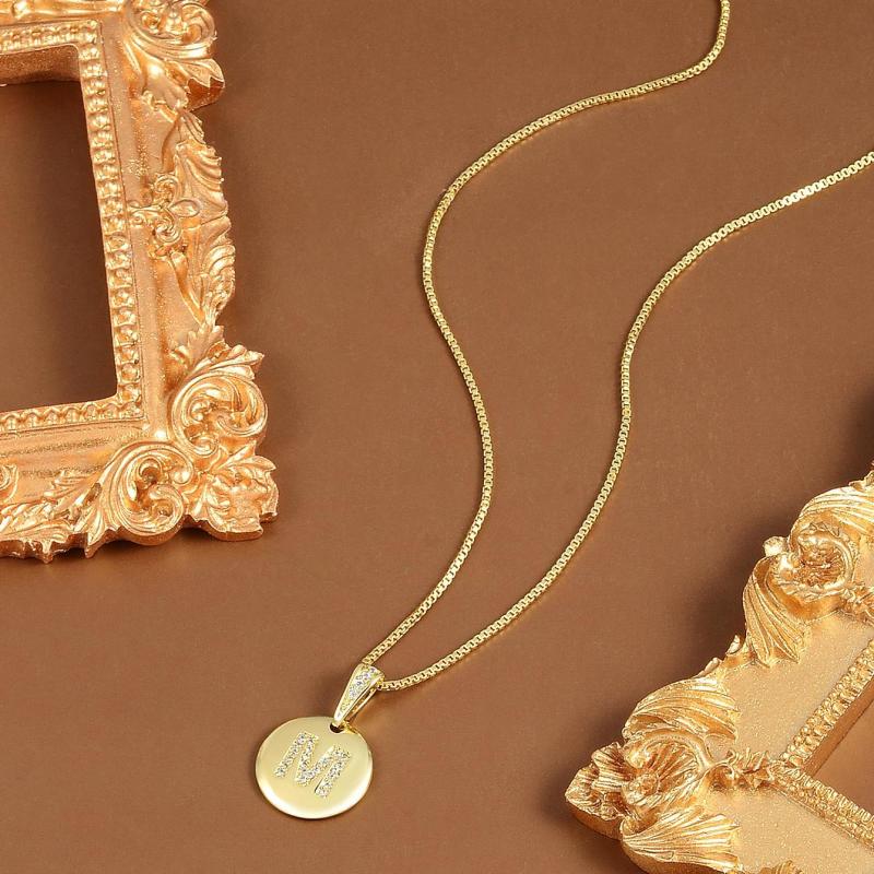 Add a touch of elegance with this golden tone pendant necklace featuring a geometric M design and sparkling cubic zirconia. Ideal for casual wear or special events.