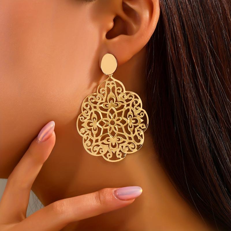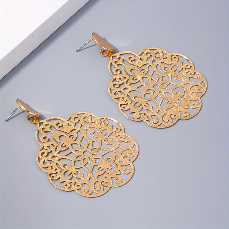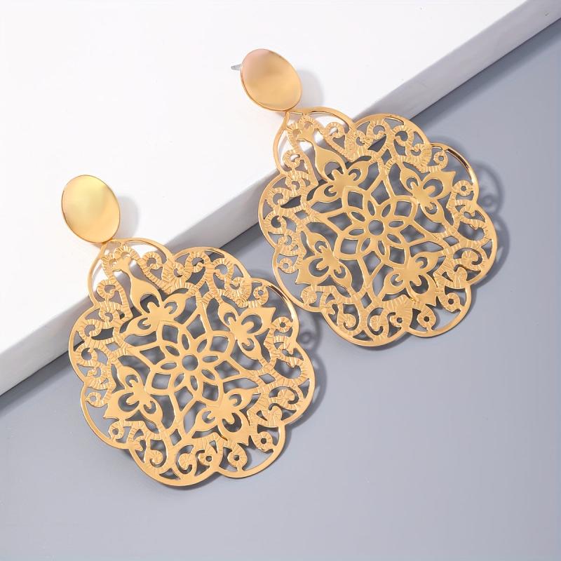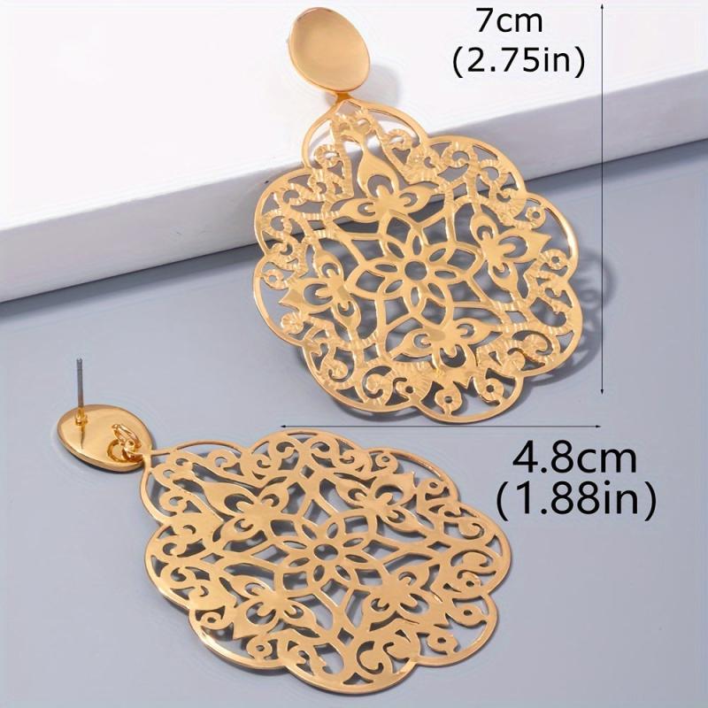 Add a touch of retro charm to your look with these fashionable metal earrings. The unique geometric oval design with a glossy finish and hollow flower detail makes them perfect for any occasion.