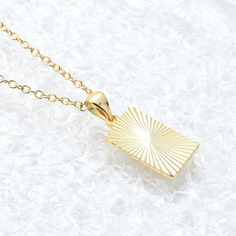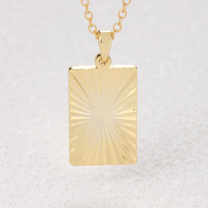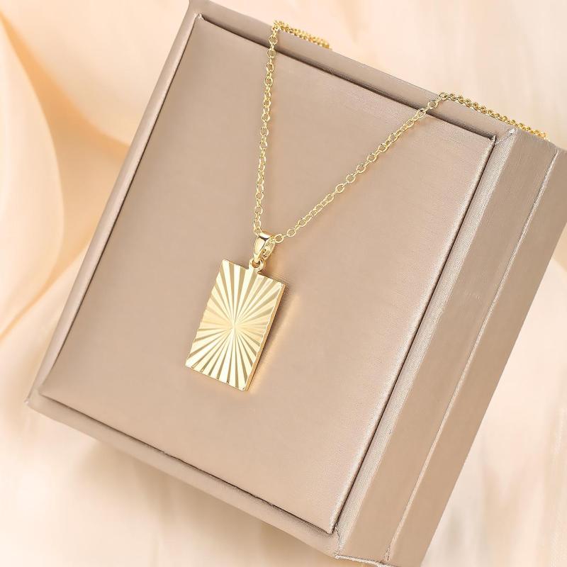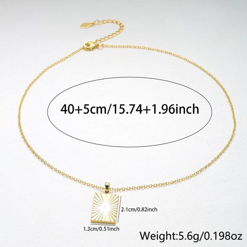 This Golden Tone necklace features a square geometric pleated pendant, perfect for adding a touch of hip hop style to your look. It is a delicate chain accessory suitable for everyday wear and vacation outfits.