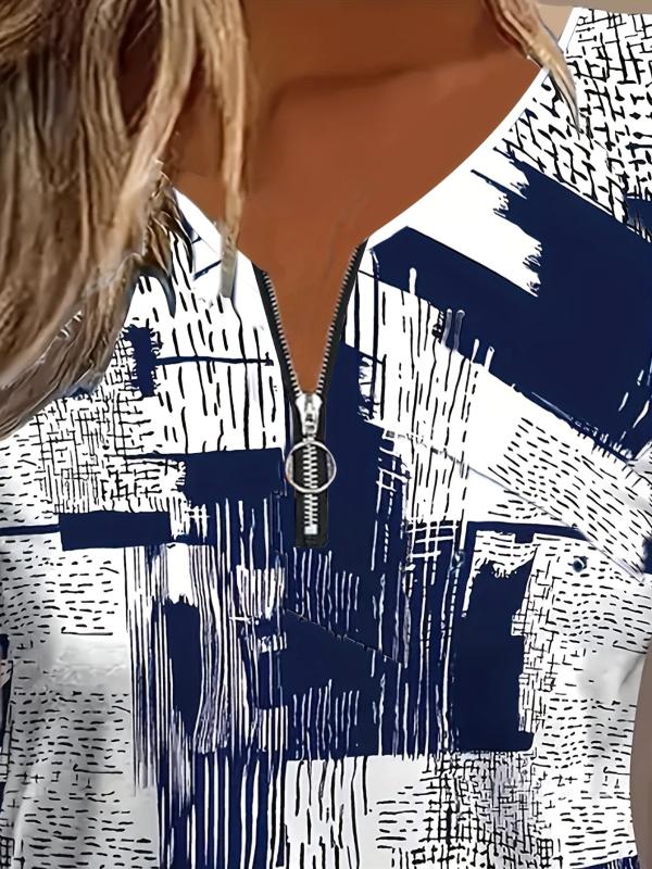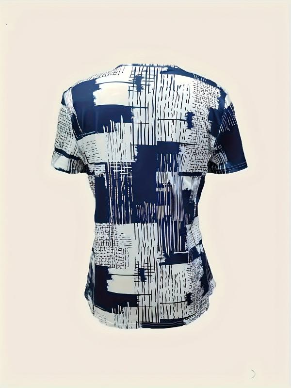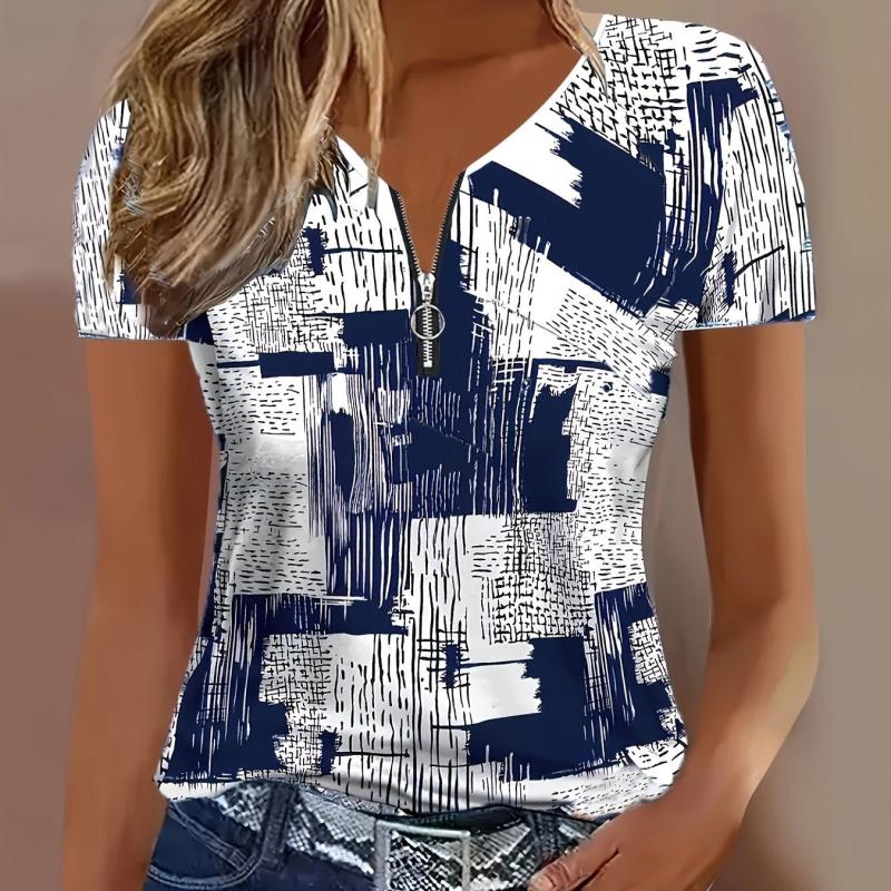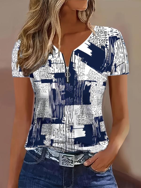 Stay stylish and comfortable with this geometric print short sleeve t-shirt featuring a zipper detail and V-neck design. Perfect for summer casual wear.