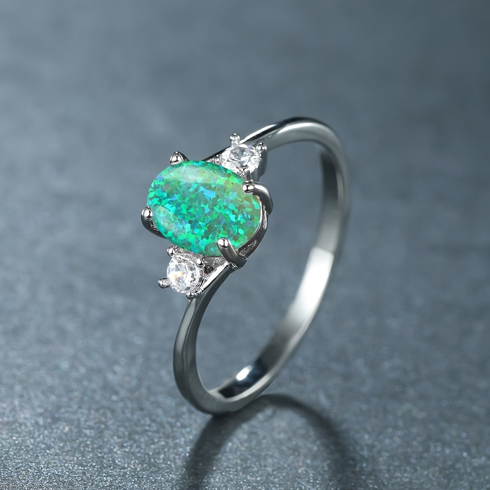 This elegant ring features a green oval ornament with a silver geometric design. It is a perfect accessory for weddings and special occasions.