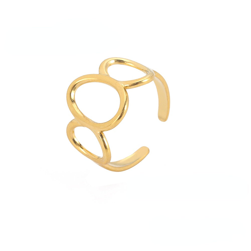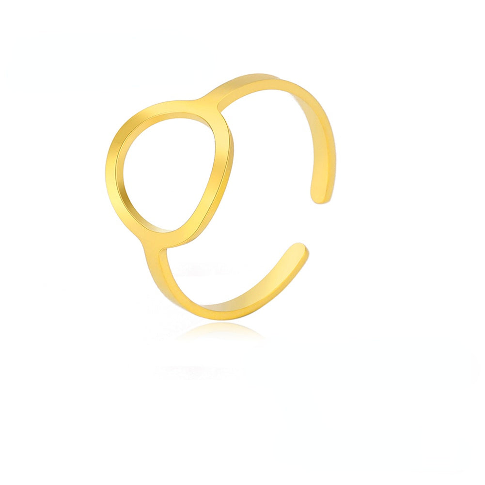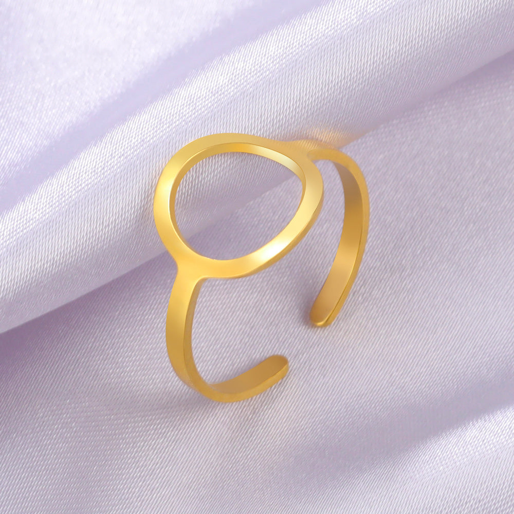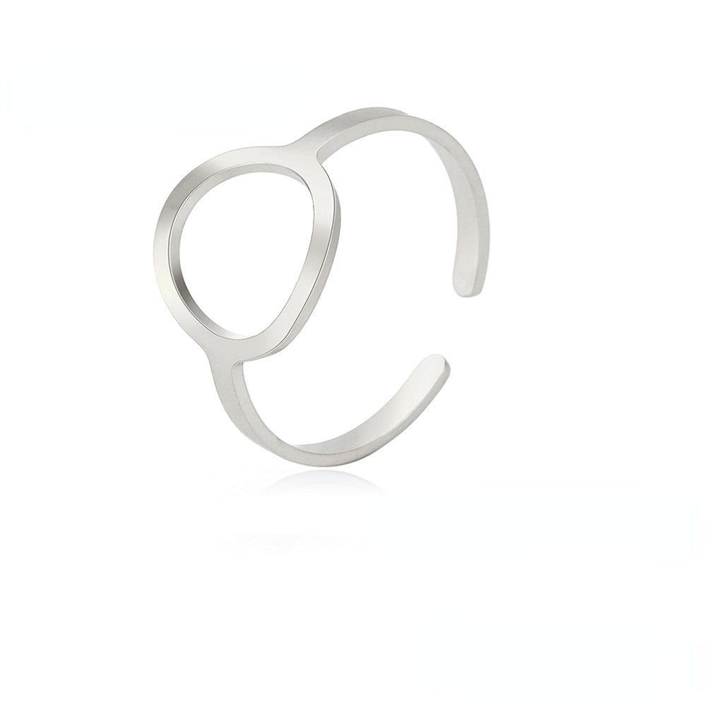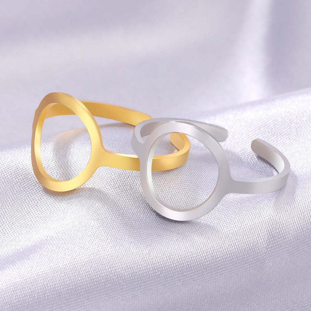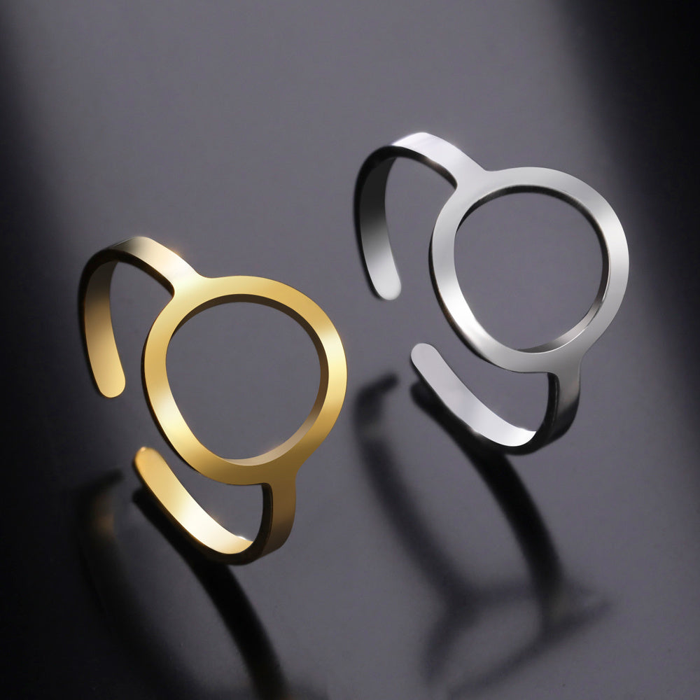 This hollow round ring features a geometric design and is made of durable stainless steel. It is adjustable to fit various sizes.