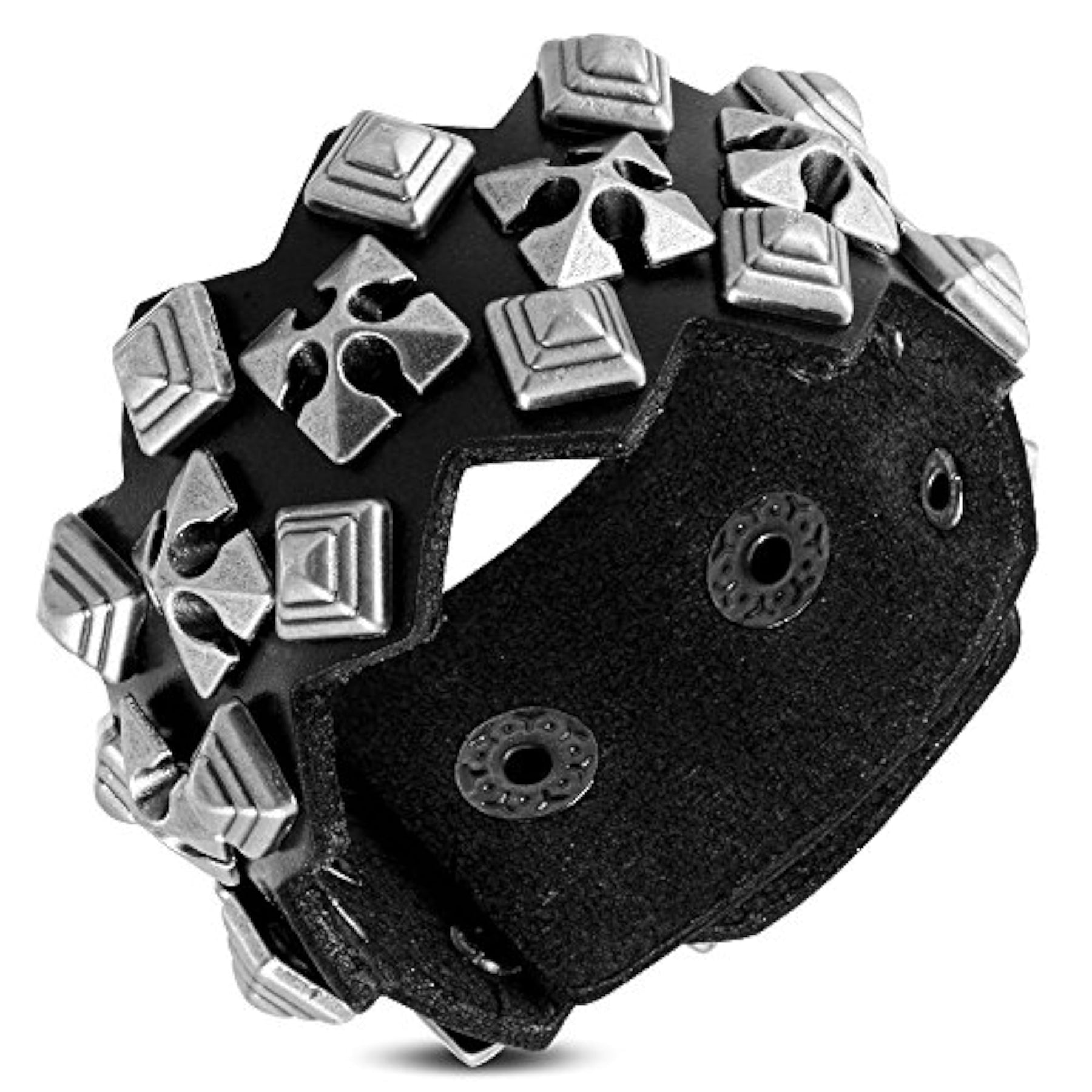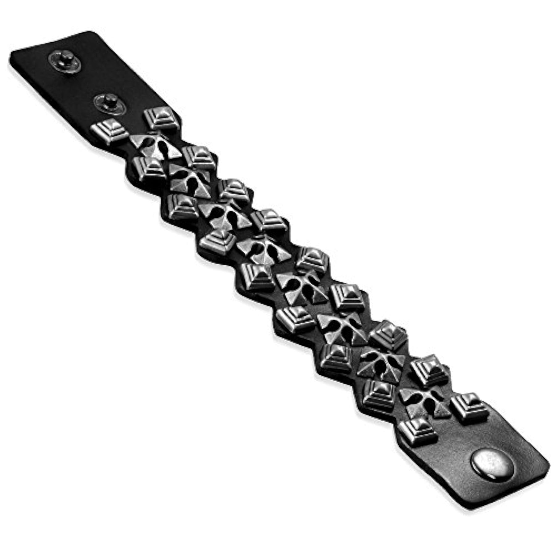 Add a touch of edgy style to your outfit with this leather biker wristband featuring geometric studs and snap closure.