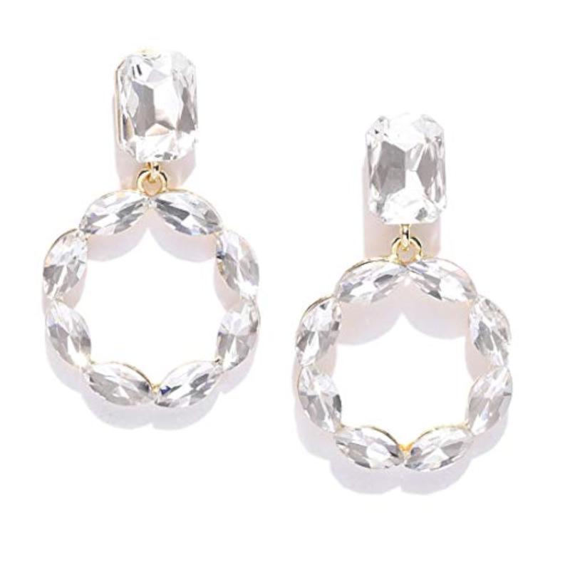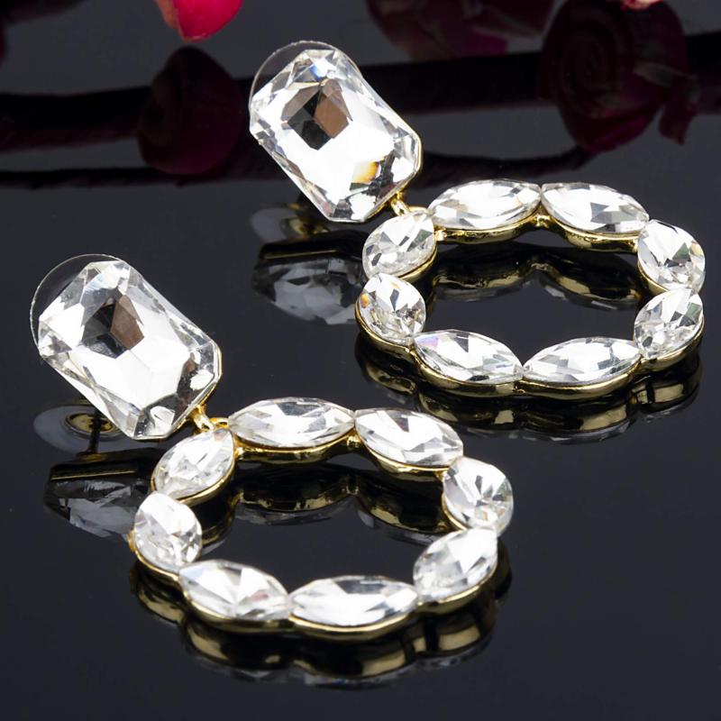 Add a touch of elegance to your ensemble with these swanky dangler earrings featuring geometric crystal plating.