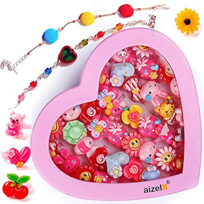 This adorable set includes fancy finger rings and bracelet for girls aged 2-10. Perfect for birthdays, comes in a heart-shaped box.