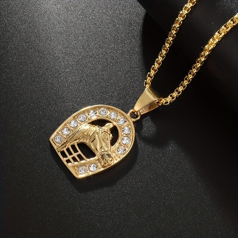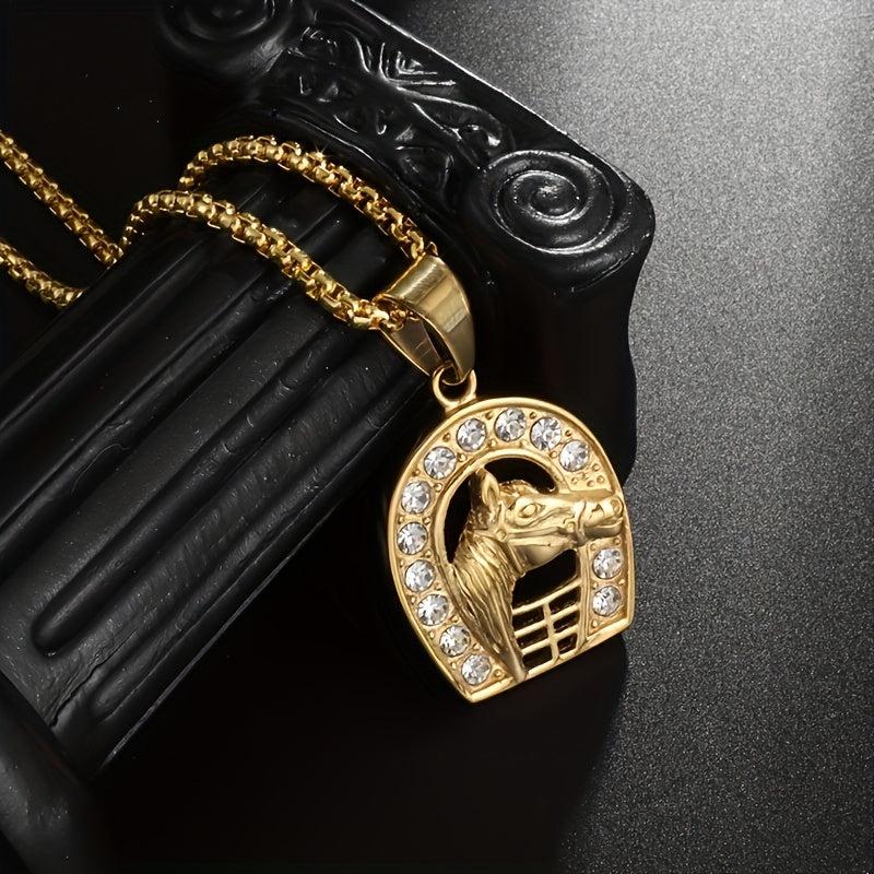 Shine at your next party with this cool horseshoe horse head pendant, perfect for hip hop and rock style. Make a statement with this unique piece of jewelry.