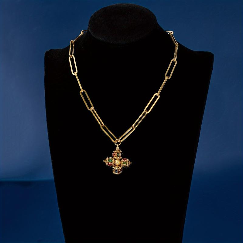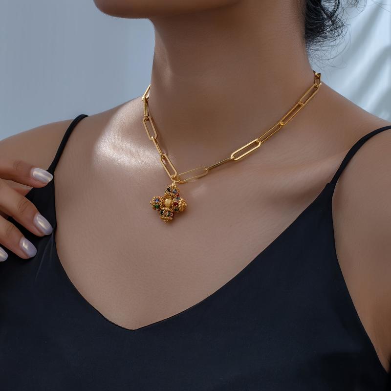 This stunning necklace features a glittering multicolor glass cross pendant on a heavy duty copper alloy chain. Perfect for daily wear or party occasions.