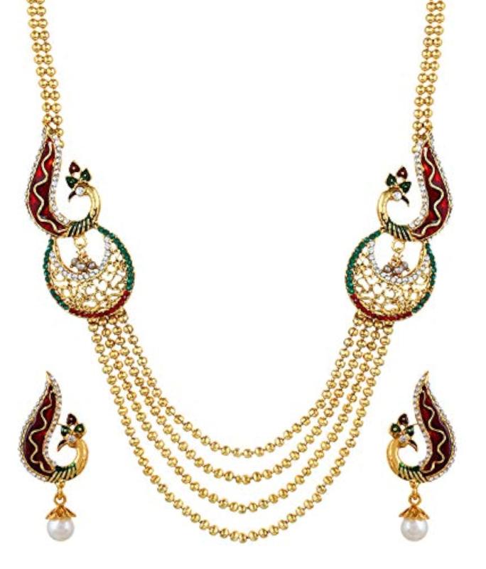 Complete your wedding look with this stunning gold-plated bridal necklace set which includes matching earrings. The intricate design and high-quality materials make this set a perfect choice for your special day.