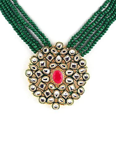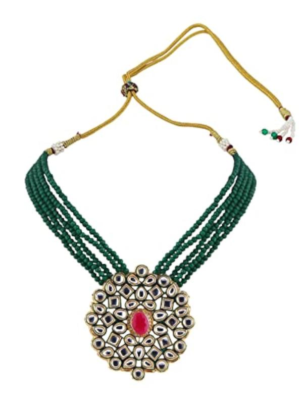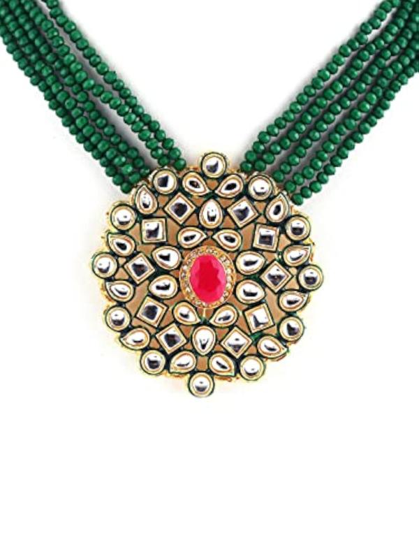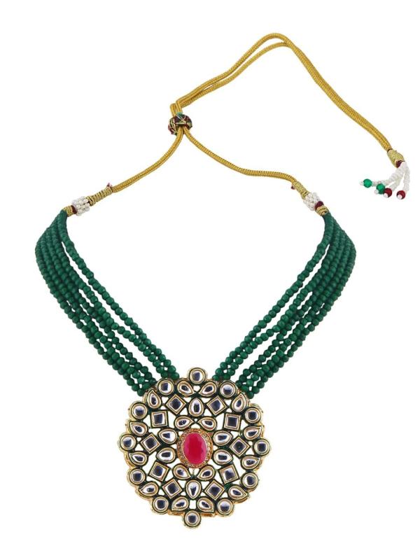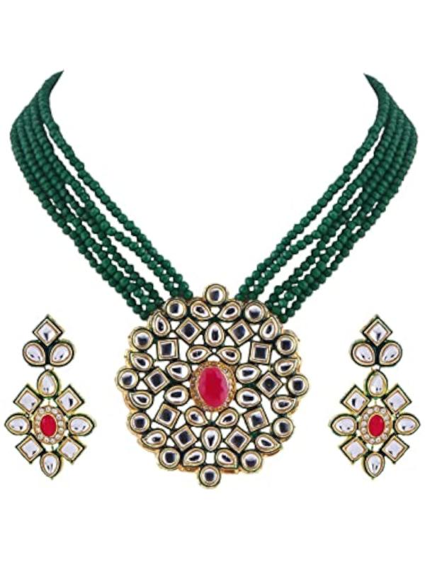 Elegant and luxurious set with intricate Kundan detailing on gold-plated base.