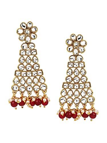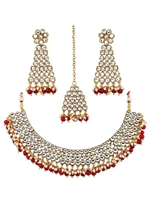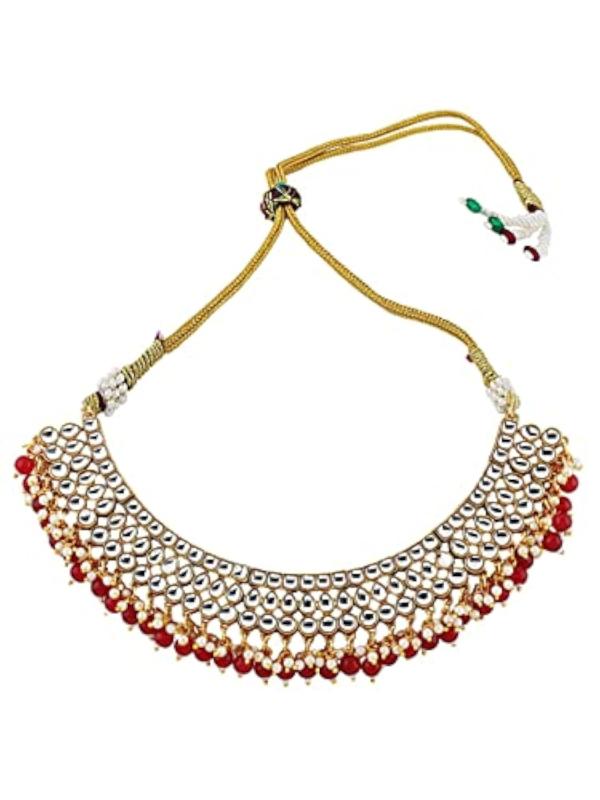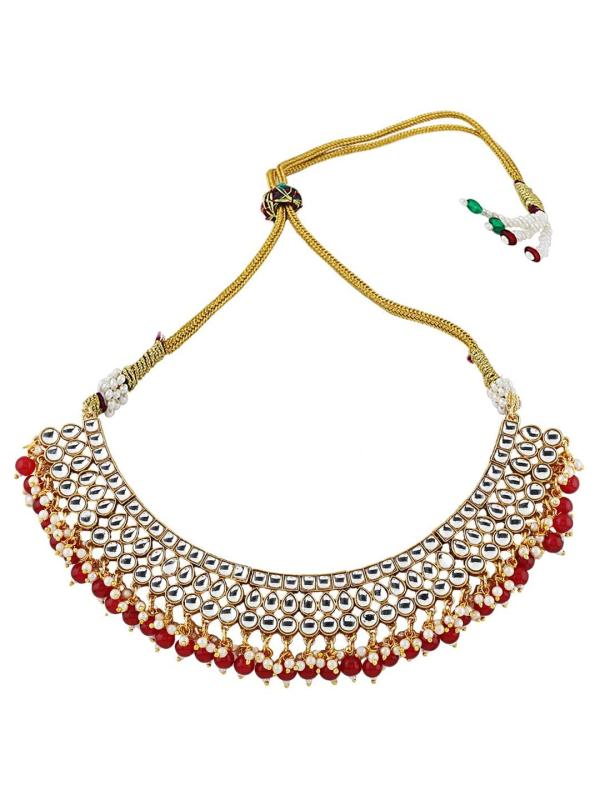 Elegant jewelry set featuring gold-plated design with kundan stones and red beads, perfect for special occasions.