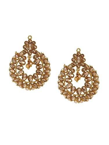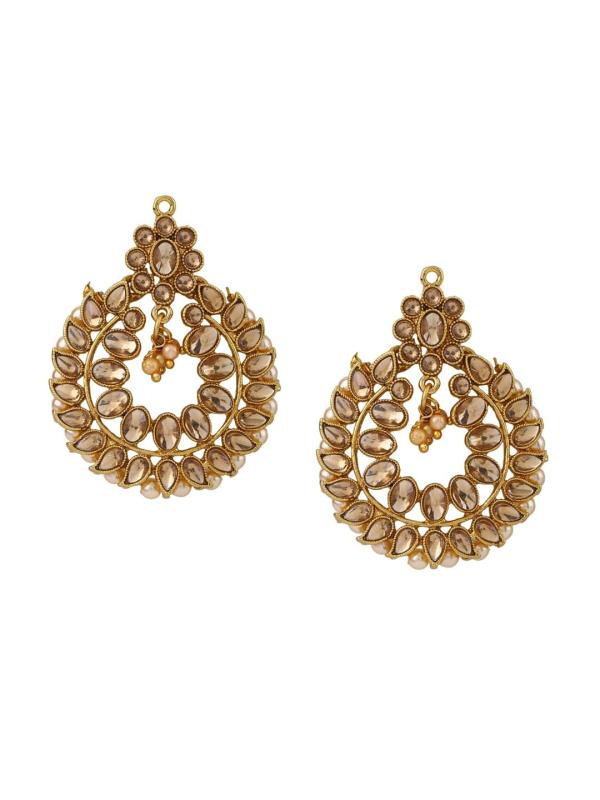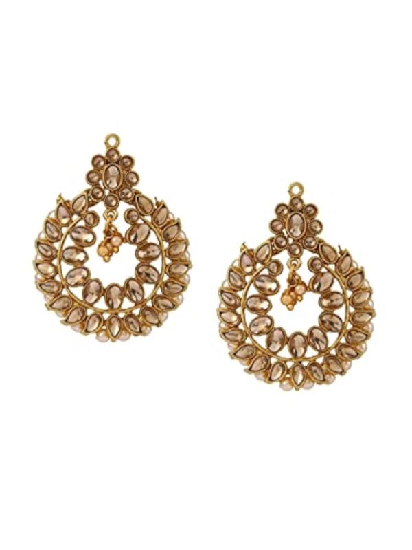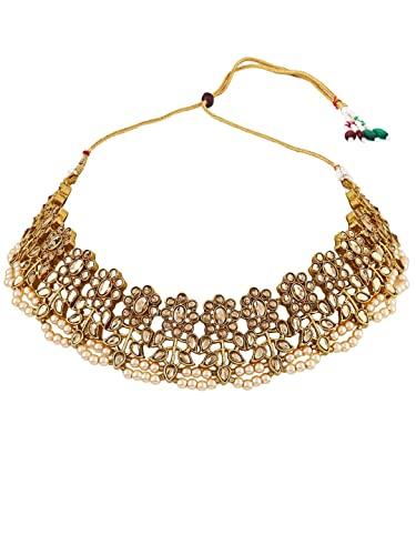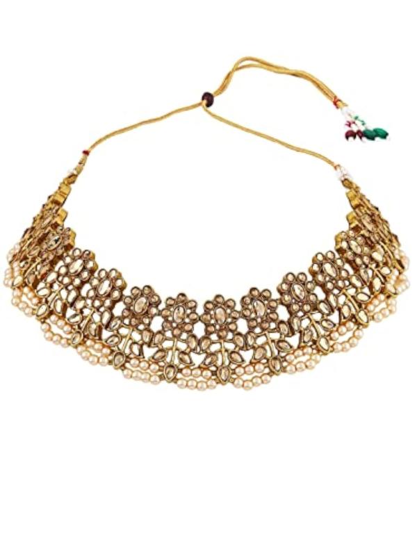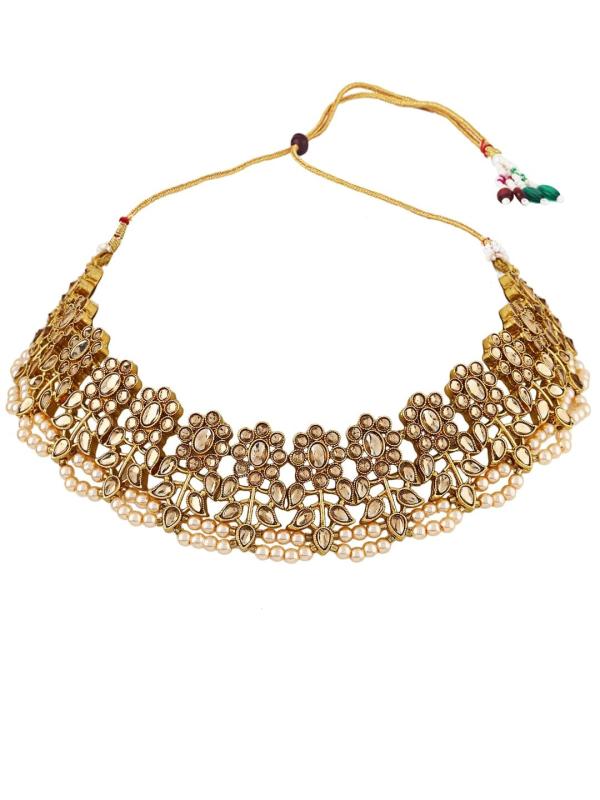 Elegant gold-plated jewelry set with cream-colored Kundan stones and beads for a sophisticated look.