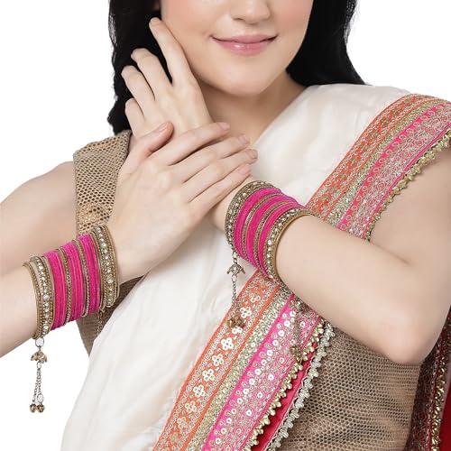 Elegant bangles set with American diamond studs and pearl tassels. Made with gold-plated matte finish velvet for a luxurious look.