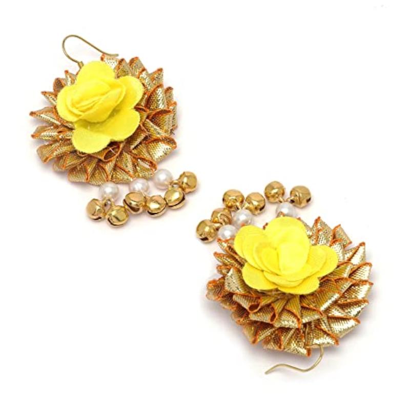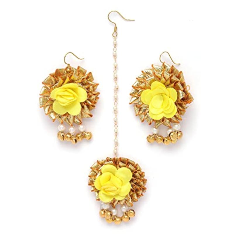 Exquisite gold-plated pearl and gota patti flower maangtikka set for haldi and mehandi ceremonies.