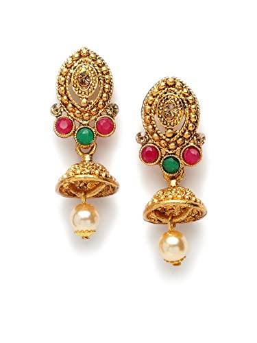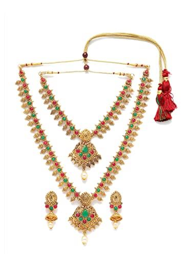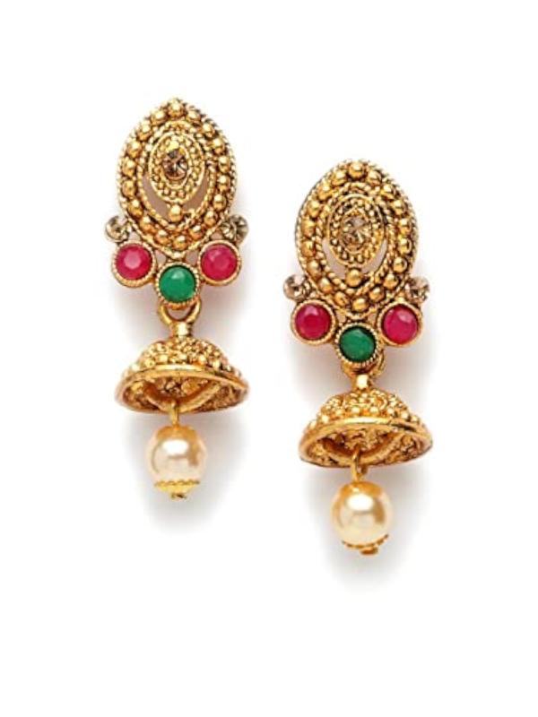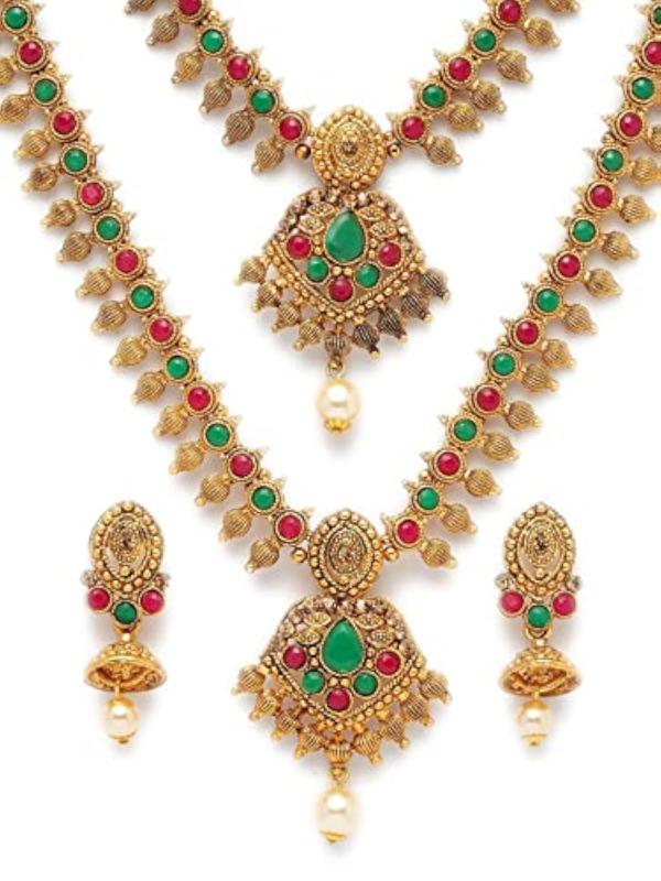 Elegant antique jewellery set with red and green stones and pearl embellishments. Perfect for special occasions.