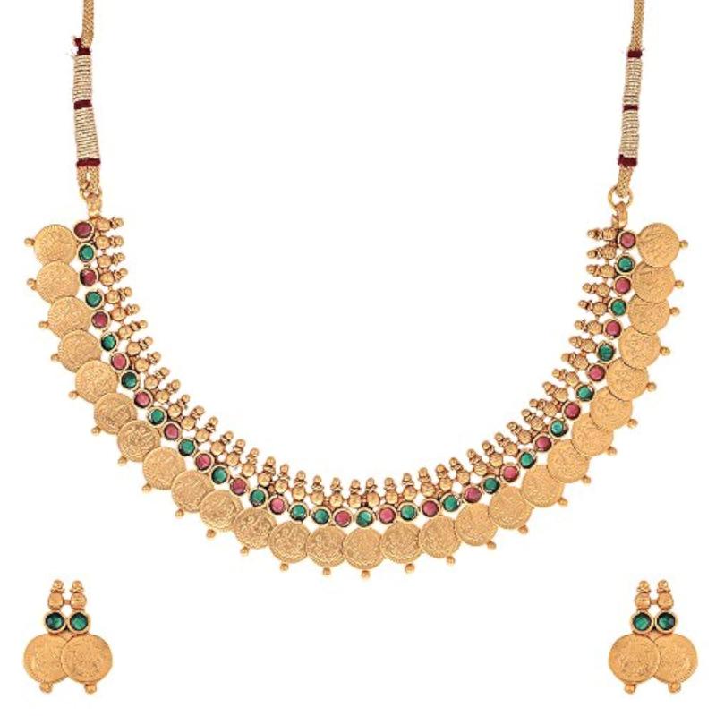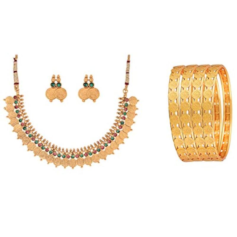 Complete your ethnic look with this stunning gold-plated jewellery set featuring a necklace, earrings, and bangle.