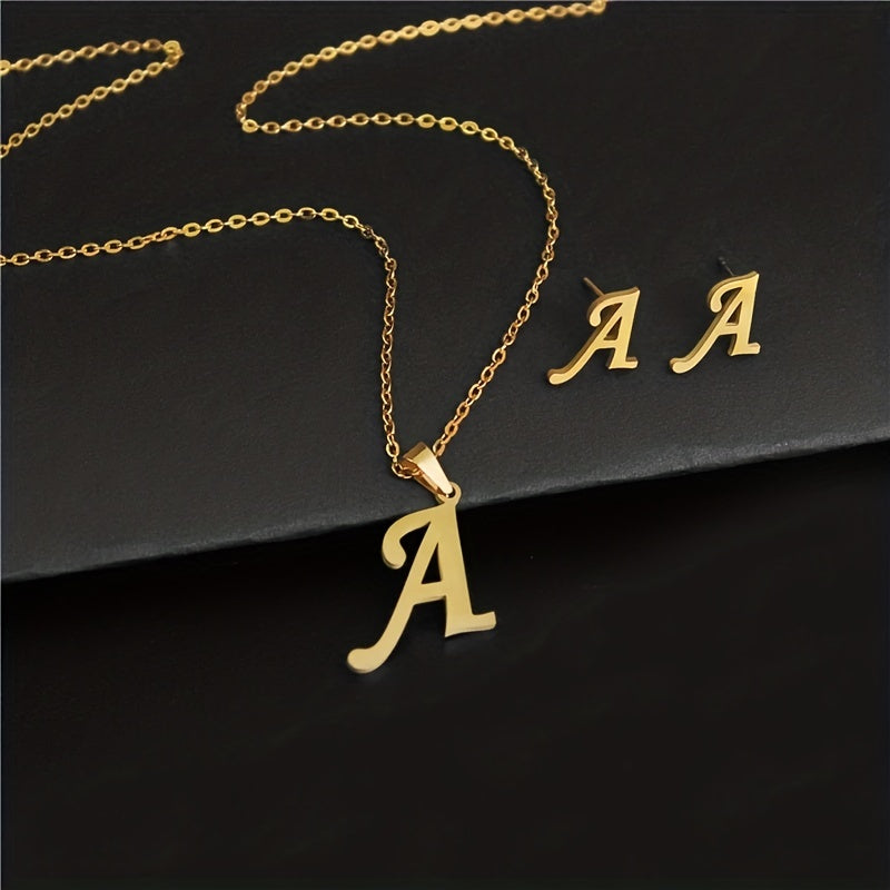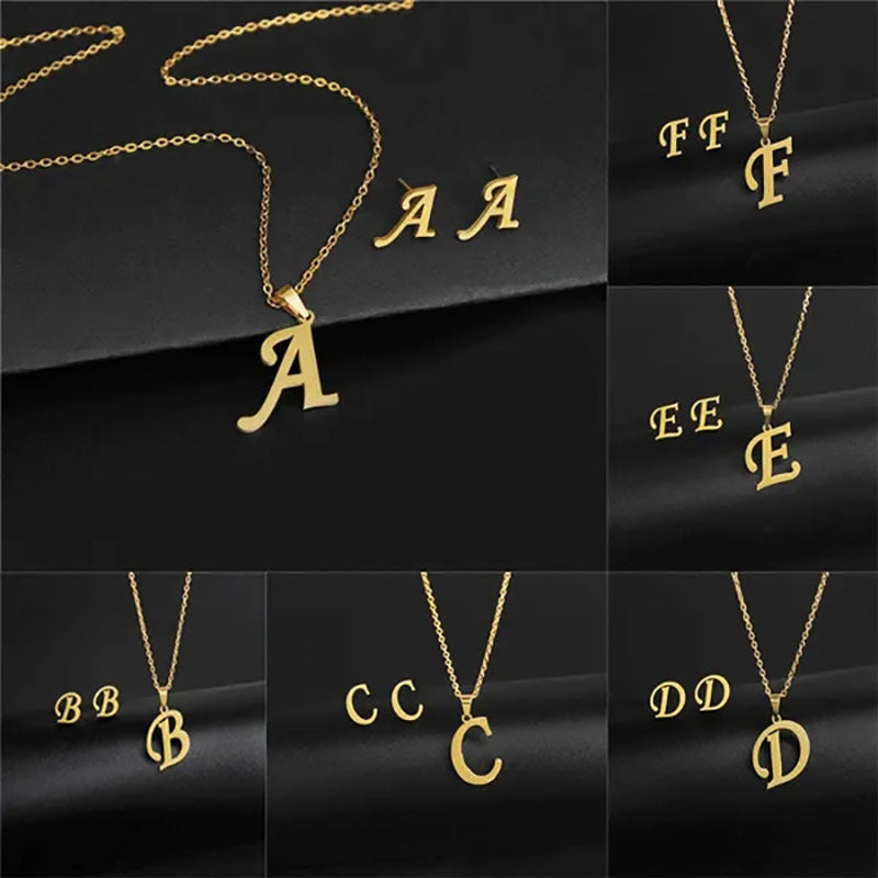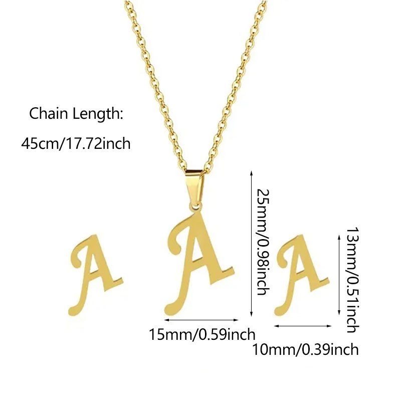 Get this stylish golden necklace and earring set featuring all 26 letters. Perfect for men's casual or formal wear.