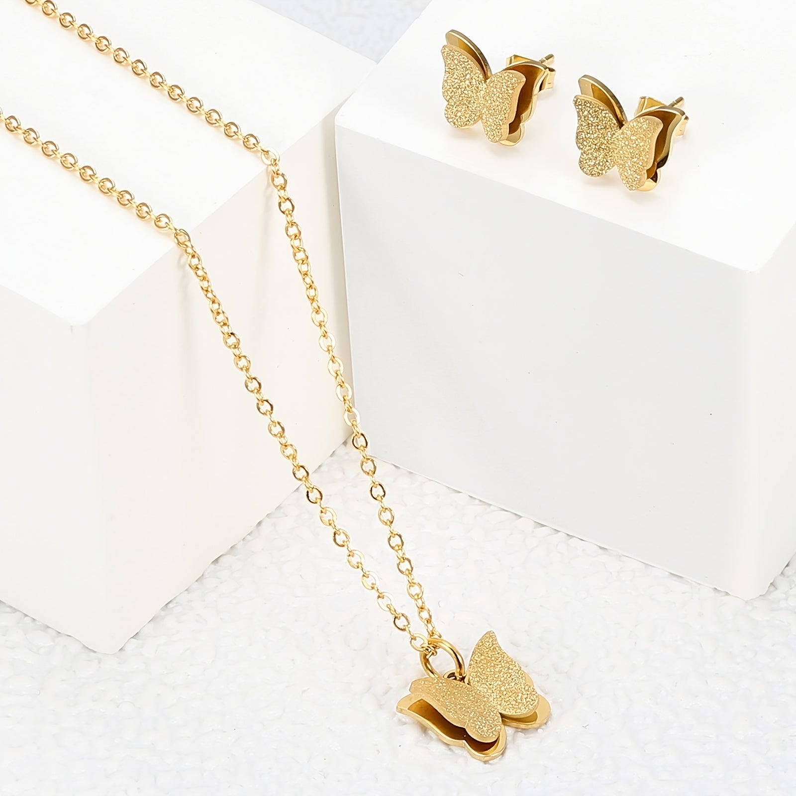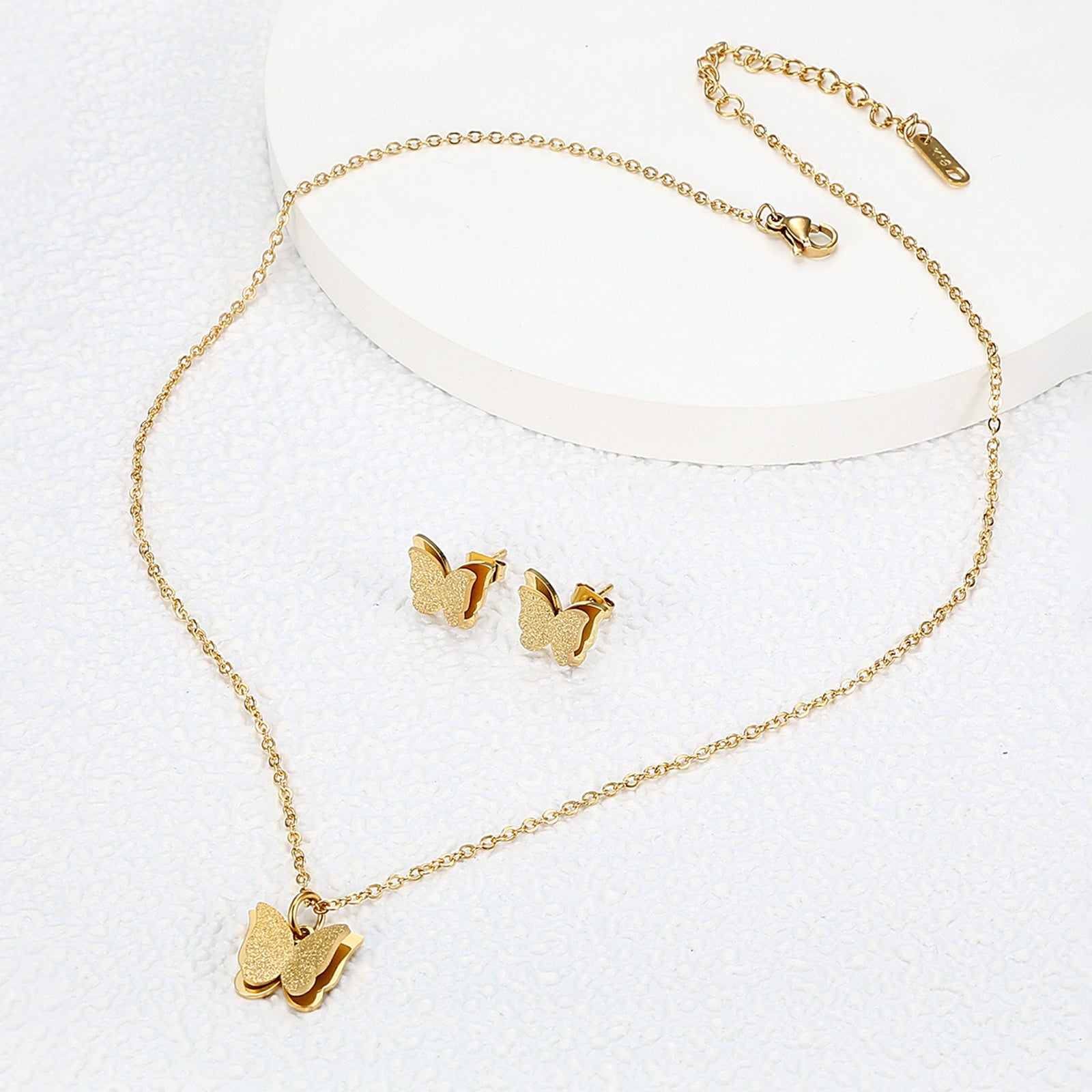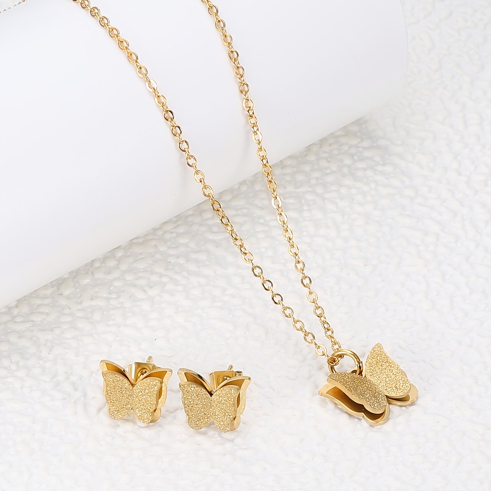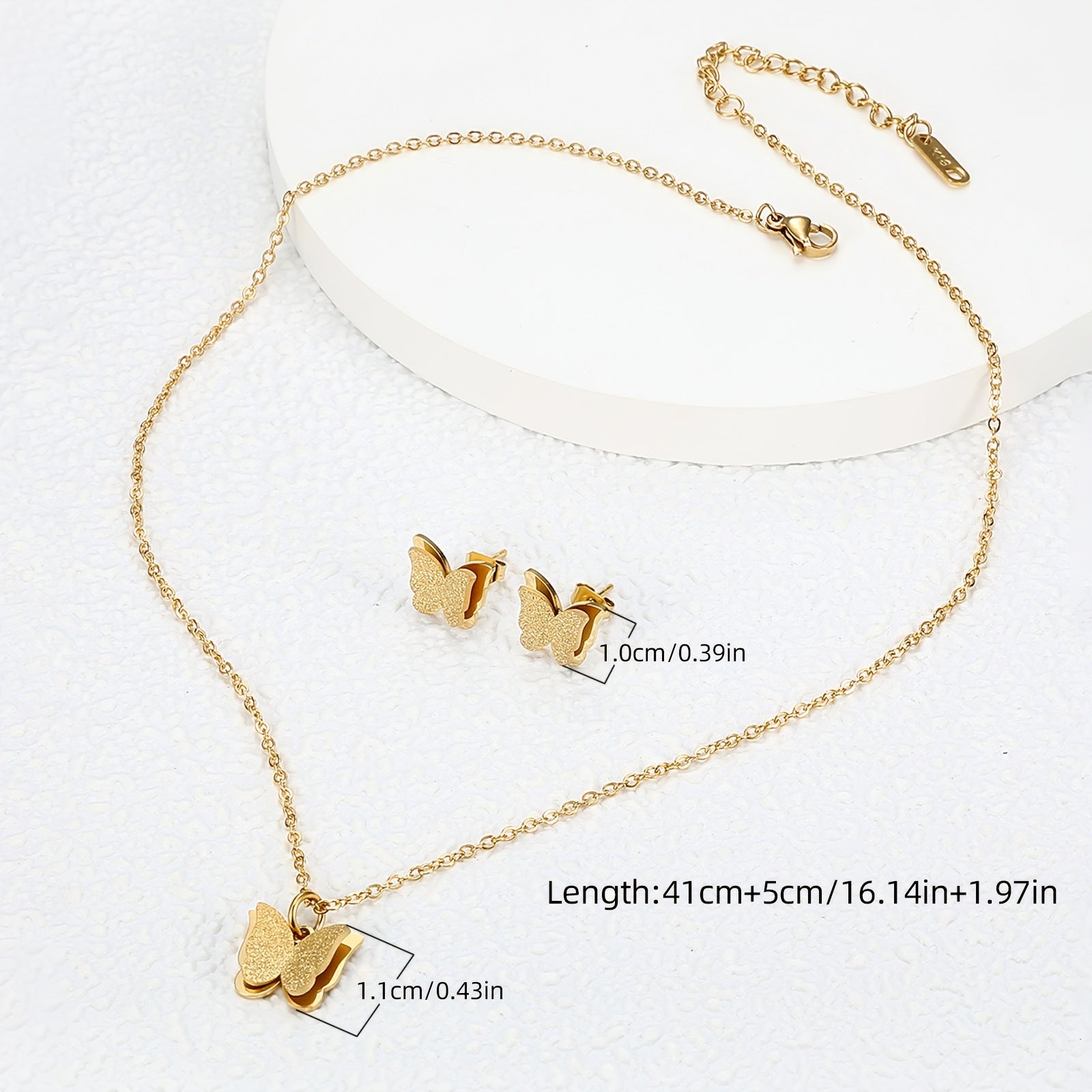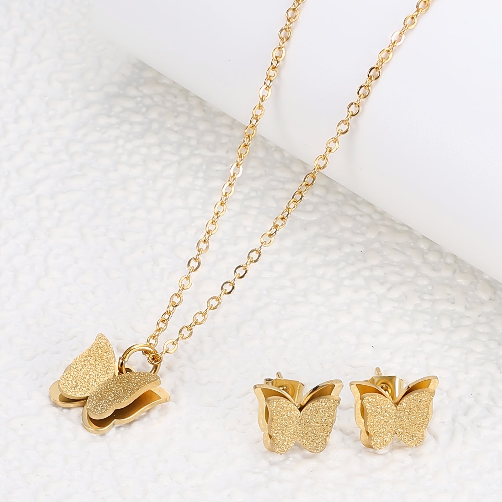 This charming jewelry set features a golden butterfly design, perfect for women and girls. Crafted with 18K gold plating on stainless steel, it is a great gift idea for any occasion.