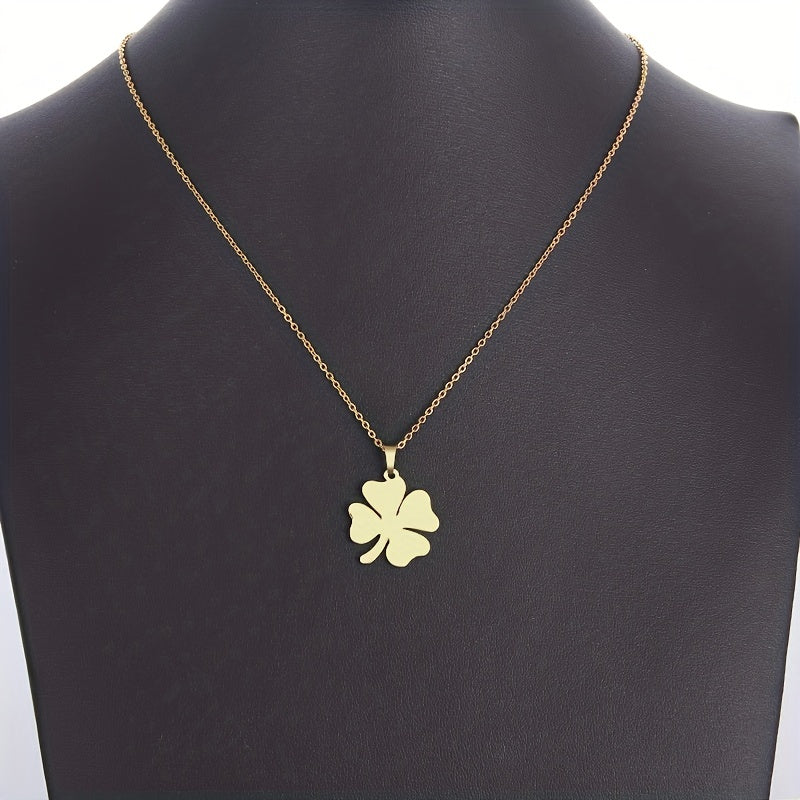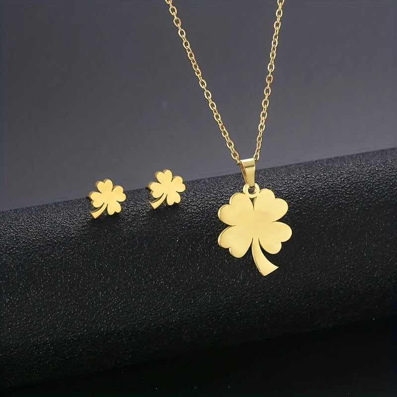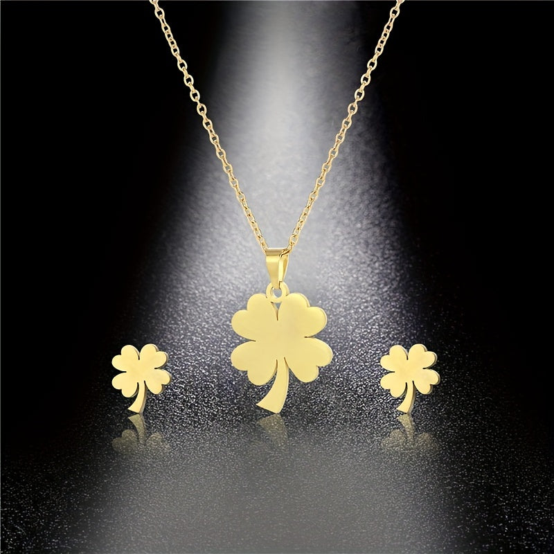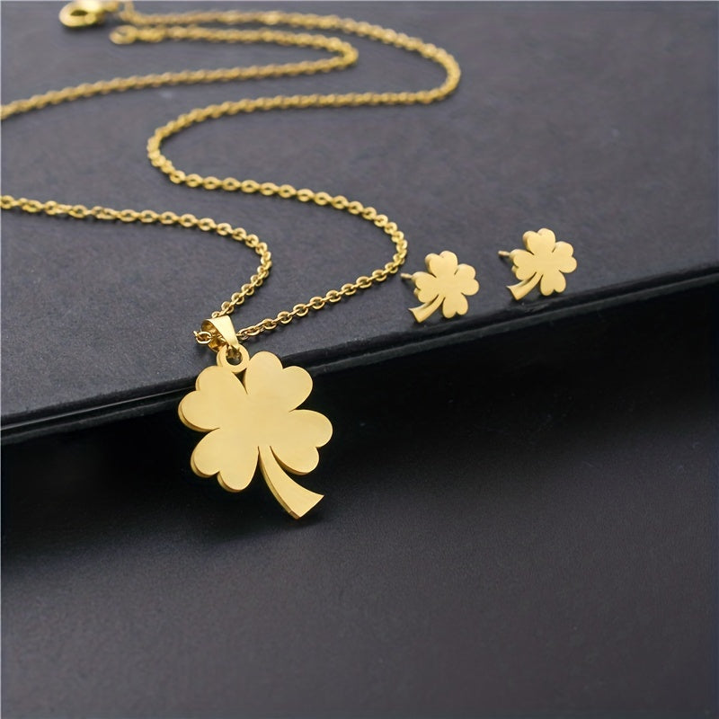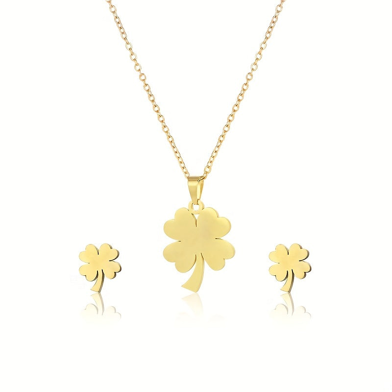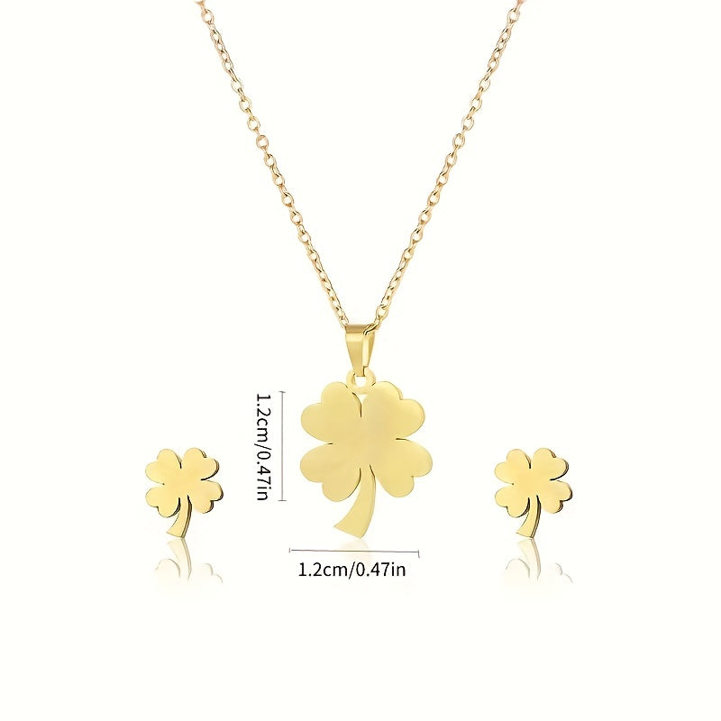 Add a touch of luck and elegance with this golden clover-shaped necklace and earring set. Made from high-quality 18K titanium steel, this set is perfect for everyday wear or special occasions. An ideal gift for someone you care about.