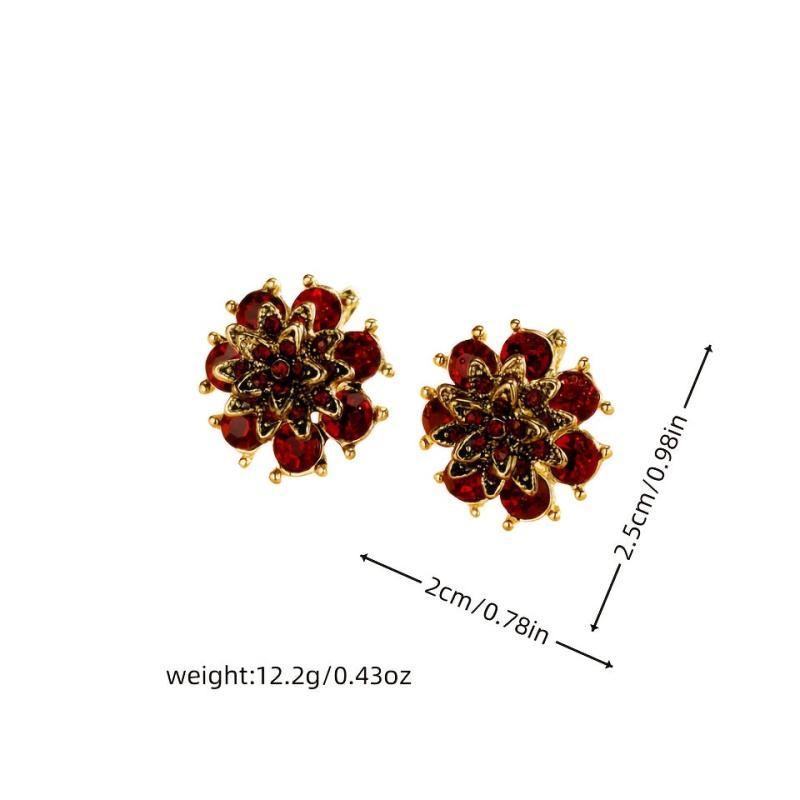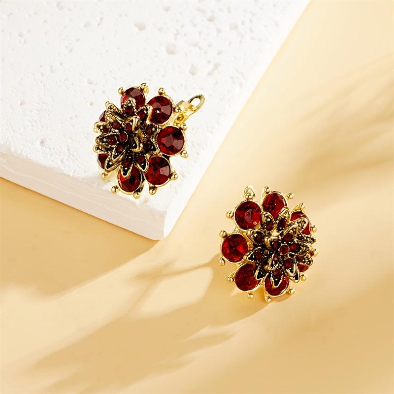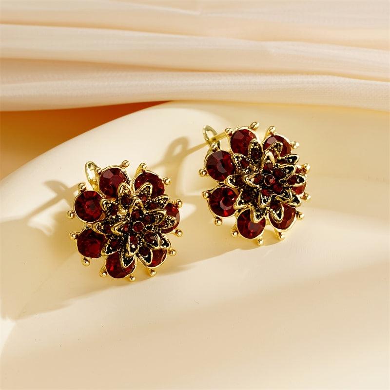 Elegant golden tone copper stud earrings featuring vintage red floral sparkling cubic zirconia accents. Perfect for weddings, parties, and everyday glamour.