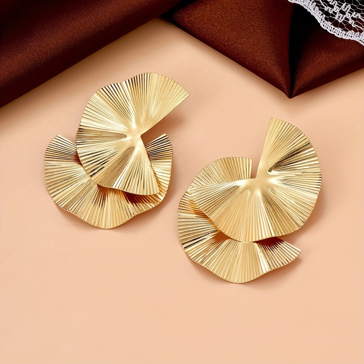 These stylish stud earrings feature a fan-shaped laser pattern design, making them a unique and creative jewelry piece. Crafted with 18K gold plating, these earrings are perfect for adding a touch of glamour to any outfit. They make a great gift for a special woman in your life.