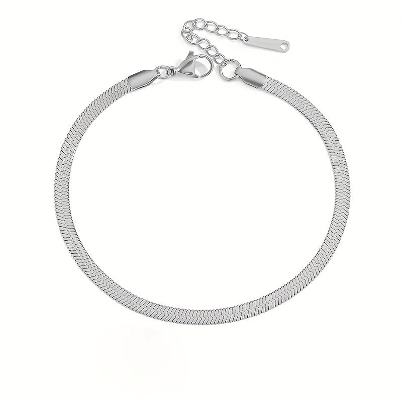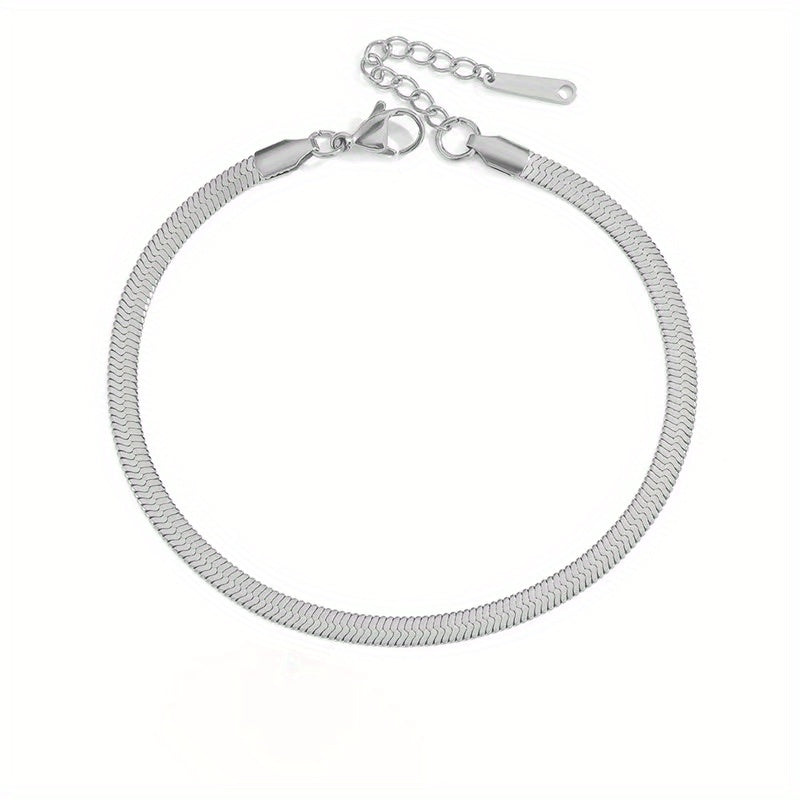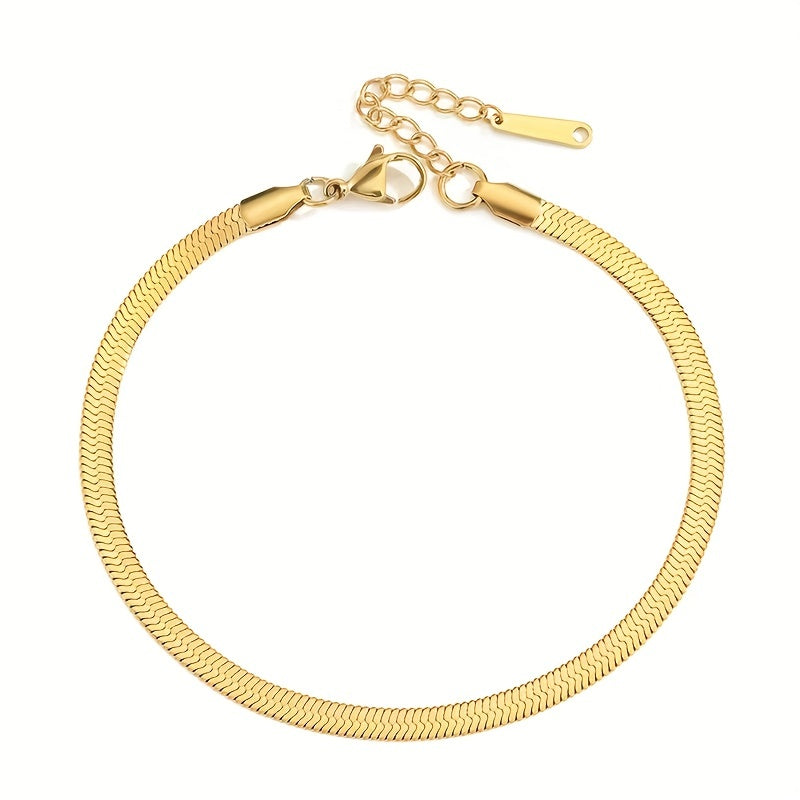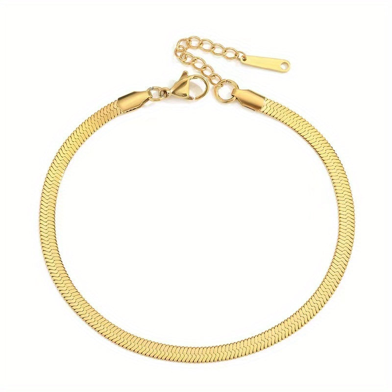 This anklet is a stylish foot accessory for both men and women. Made of stainless steel, the golden flat snake chain design adds a touch of elegance to your look.