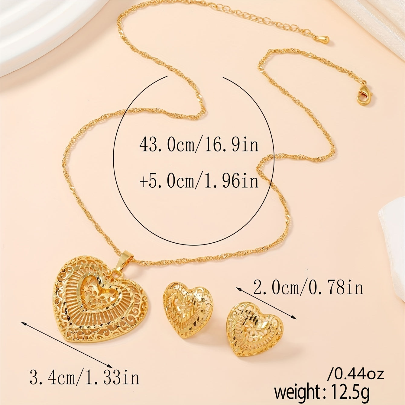• Set includes 3pcs earrings and necklace with golden heart design