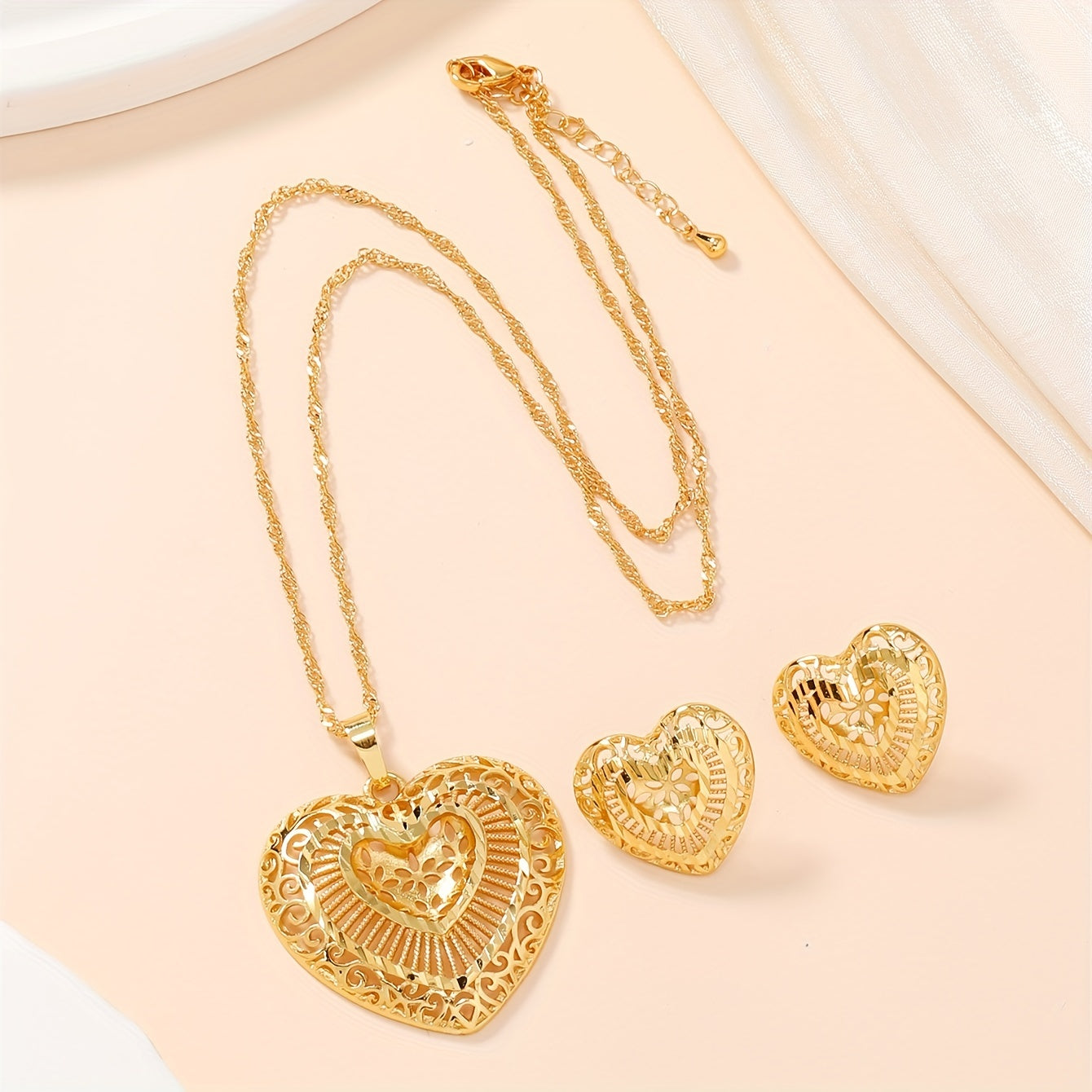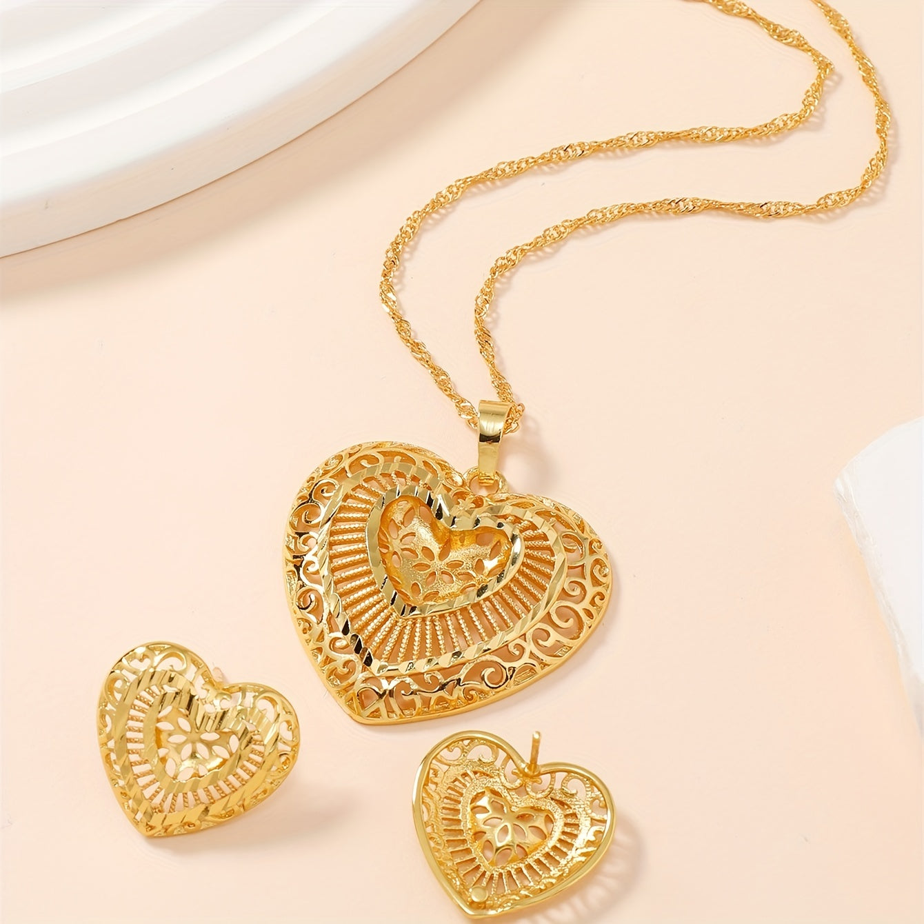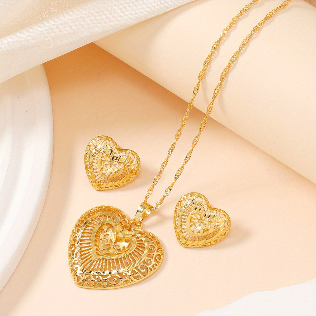 This elegant jewelry set includes 3pcs earrings and necklace, all featuring a golden heart design. Ideal for evening parties or as a special gift for her. The set is plated with 22k gold, adding a touch of luxury.