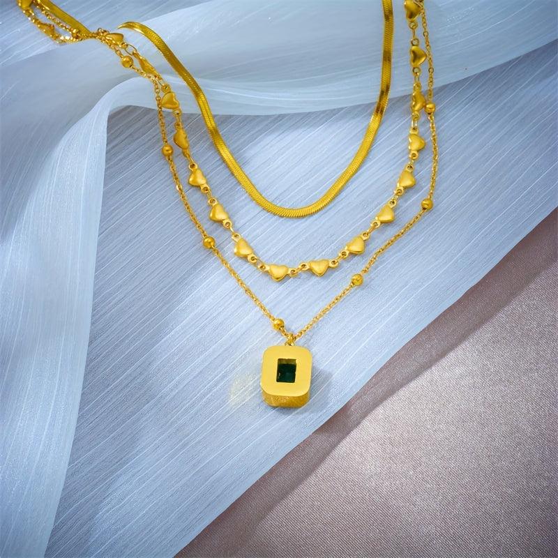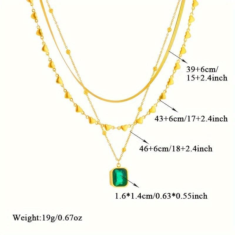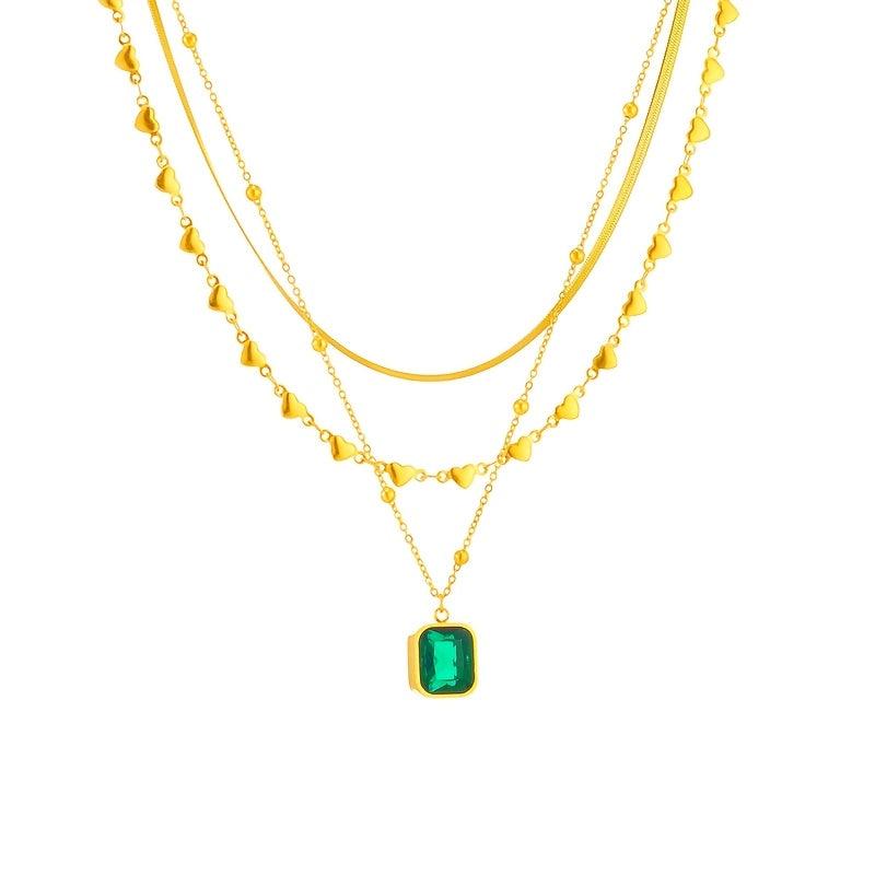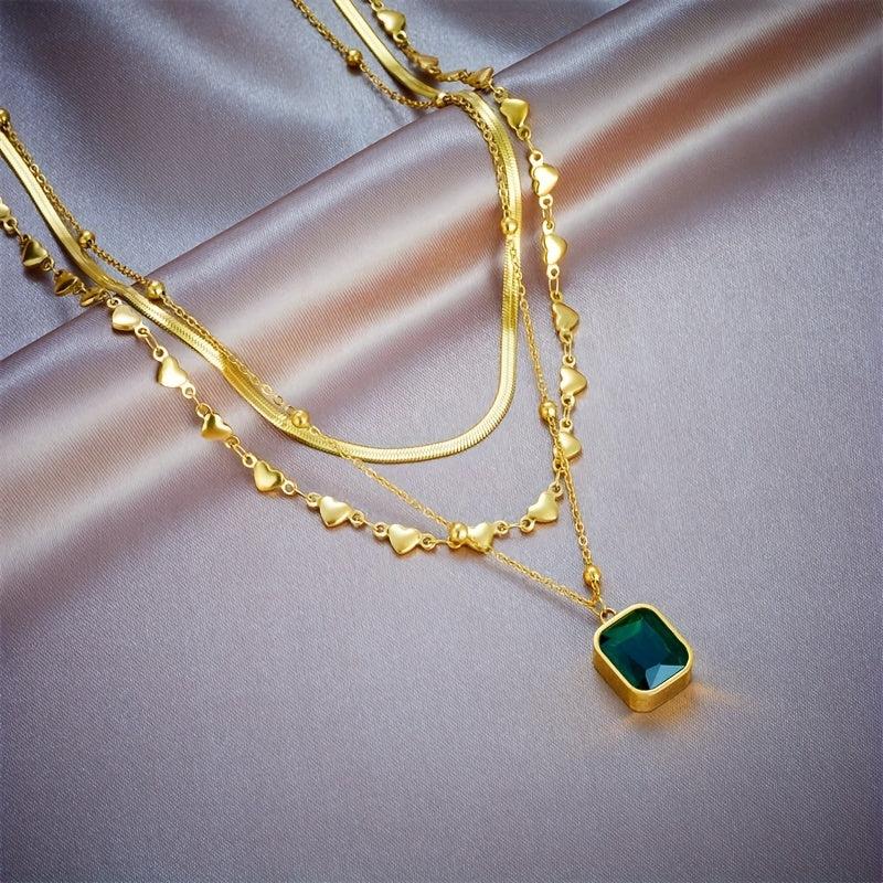 This stunning necklace features a golden stainless steel chain with a vibrant green glass pendant, perfect for those who love bohemian and vintage styles.