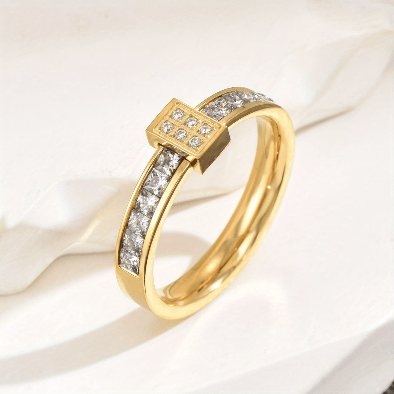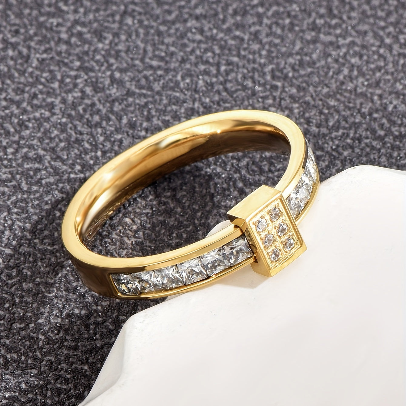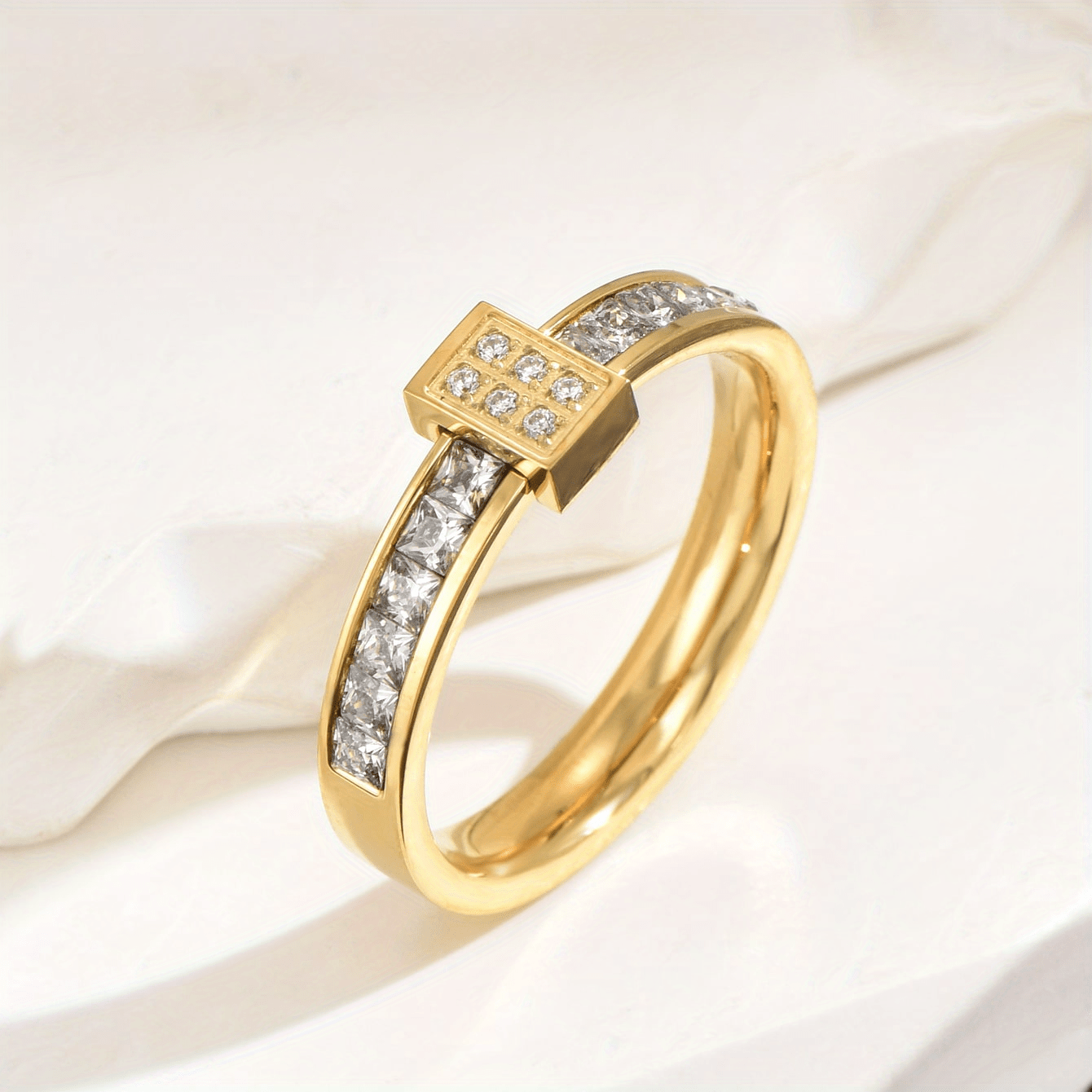 Stylish stainless steel ring with square zircon inlay and artificial diamond accents. Perfect for adding a touch of sophistication to any outfit.