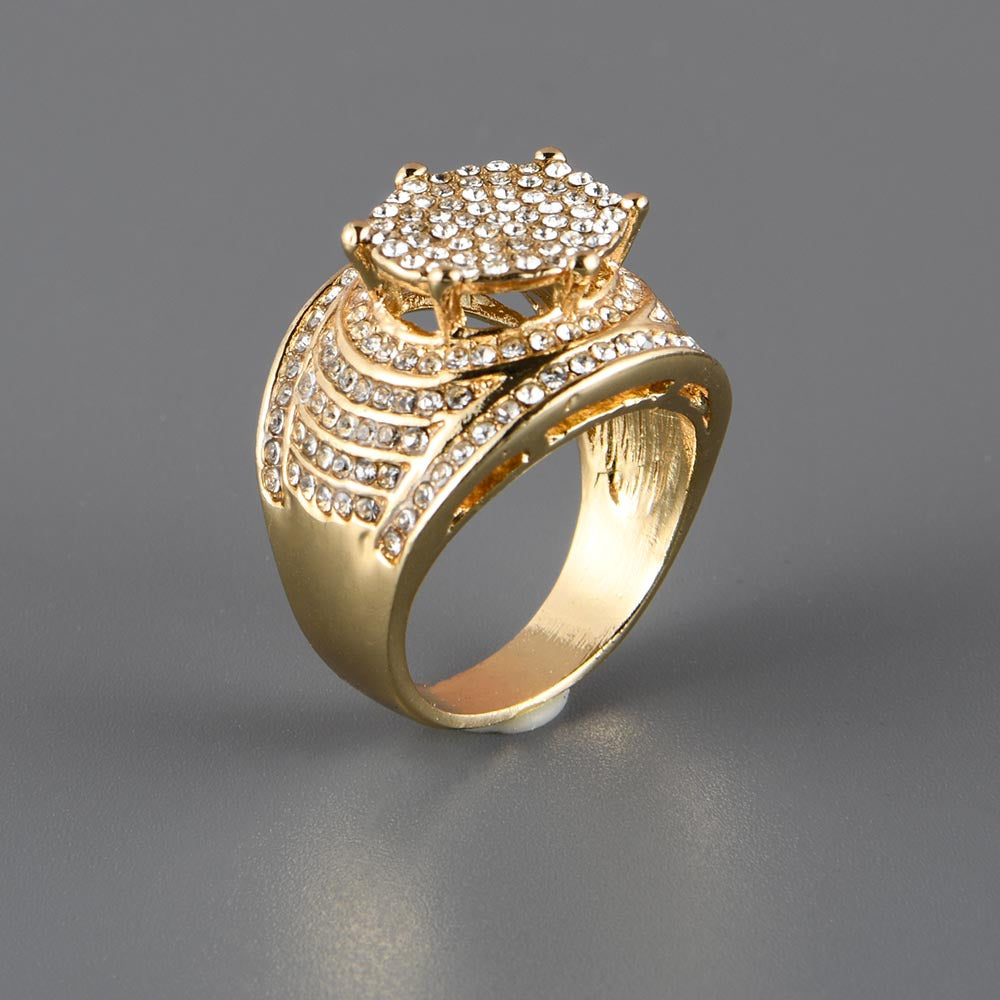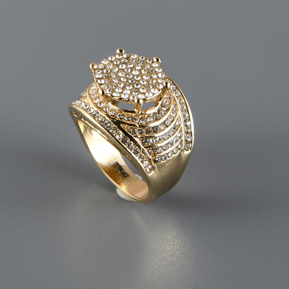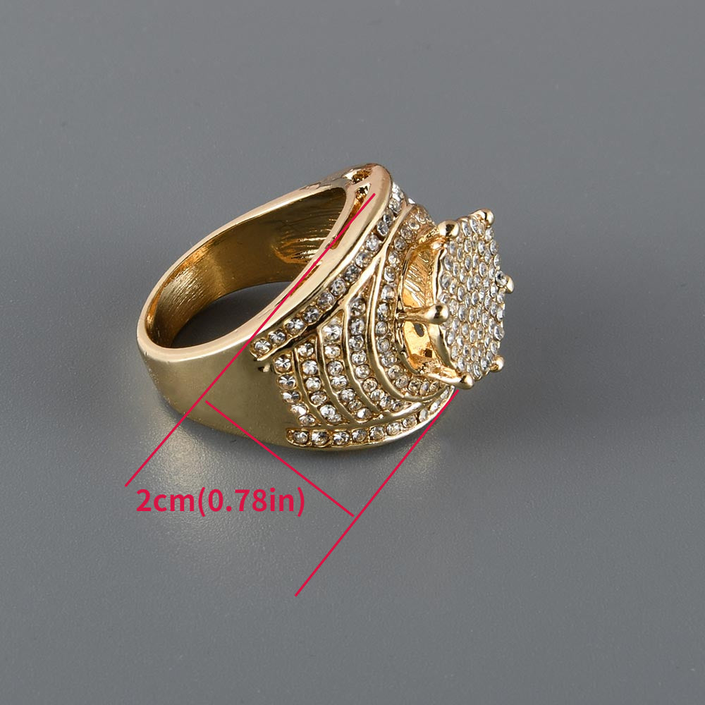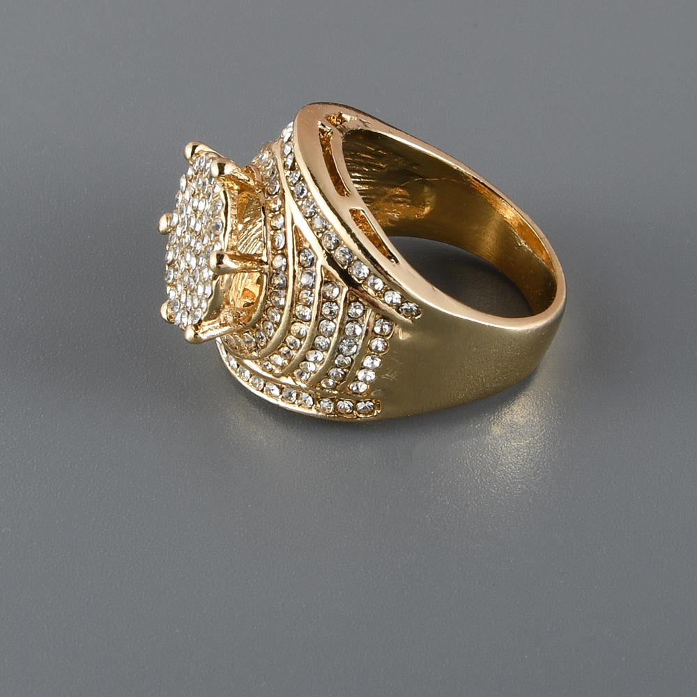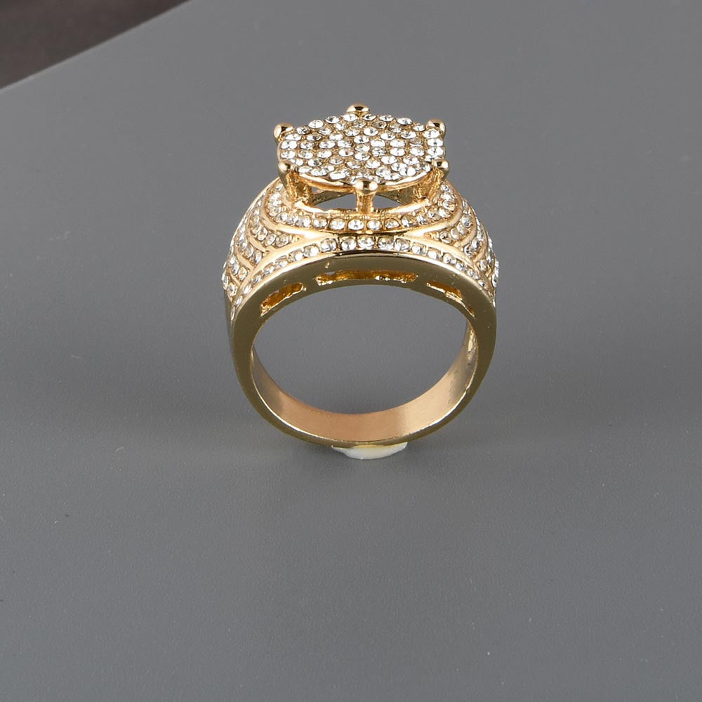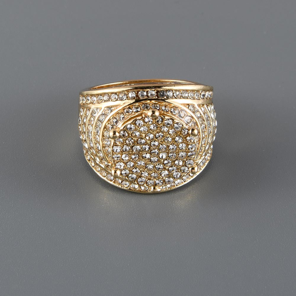 This elegant ring features a golden plated band with small round rhinestones inlaid for added sparkle.